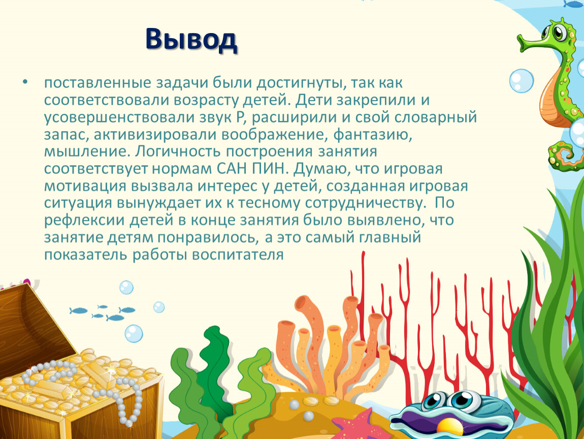 поставленные задачи были достигнуты, так как соответствовали возрасту детей. Дети закрепили и усовершенствовали звук Р, расширили и свой словарный запас, активизировали воображение, фантазию, мышление. Логичность построения занятия соответствует нормам САН ПИН. Думаю, что игровая мотивация вызвала интерес у детей, созданная игровая ситуация вынуждает их к тесному сотрудничеству. По рефлексии детей в конце занятия было выявлено, что занятие детям понравилось, а это самый главный показатель работы воспитателя