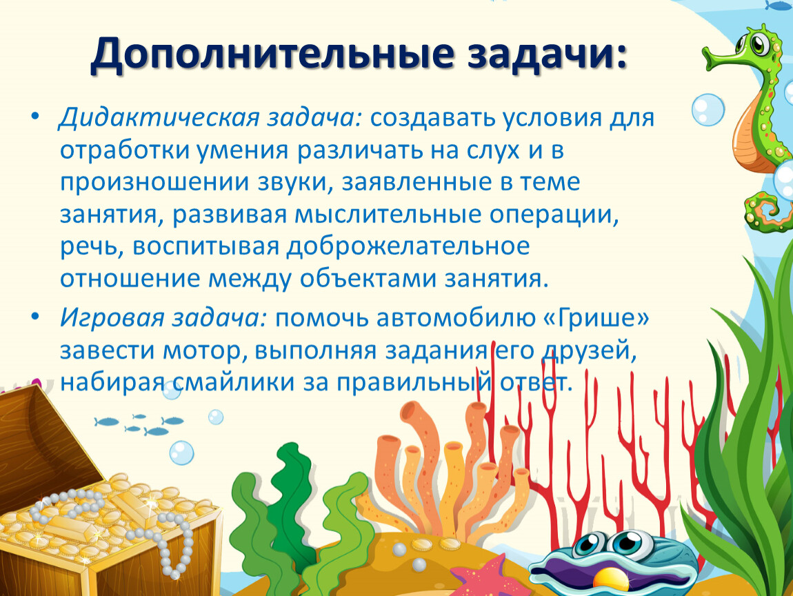 Дидактическая задача: создавать условия для отработки умения различать на слух и в произношении звуки, заявленные в теме занятия, развивая мыслительные операции, речь, воспитывая доброжелательное отношение между объектами занятия.