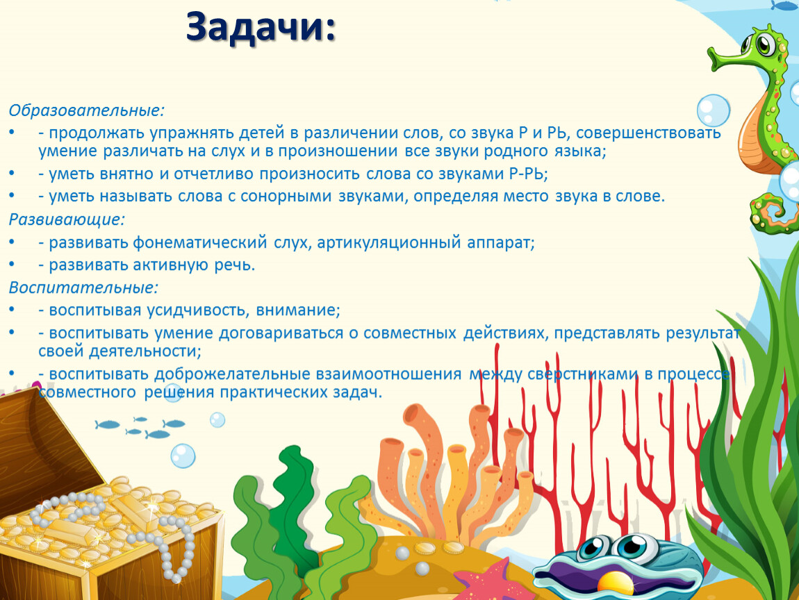 Цель для педагога: отработка умений различать на слух и в произношении все звуки родного языка; внятно и отчетливо произносить слова со звуками Р-РЬ; называть слова с сонорными звуками, определяя место в слове, развивая активную речь при ответах, воспитывая усидчивость, внимание, умение договариваться, работая со сверстниками и взрослыми и доброжелательное отношение между ними.