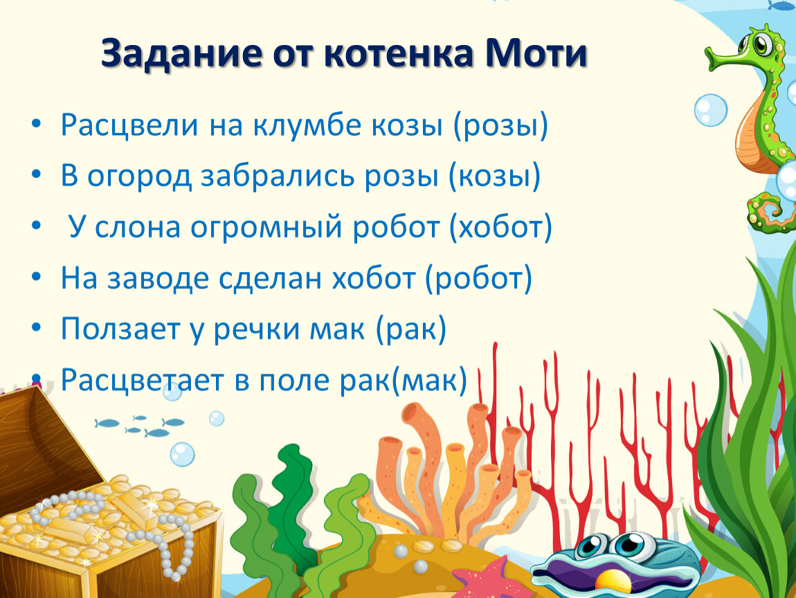 Цель для ребёнка: умение различать на слух и в произношении все звуки родного языка; внятно и отчетливо произносить слова со звуками Р-РЬ; называть слова с сонорными звуками, определяя место в слове, развивая активную речь при ответах; выполнять правильно задания, зарабатывая смайлики.