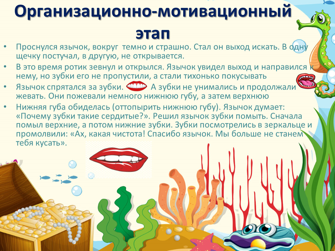 Нижняя губа обиделась (оттопырить нижнюю губу). Язычок думает: «Почему зубки такие сердитые?». Решил язычок зубки помыть. Сначала помыл верхние, а потом нижние зубки. Зубки посмотрелись в зеркальце и промолвили: «Ах, какая чистота! Спасибо язычок. Мы больше не станем тебя кусать».