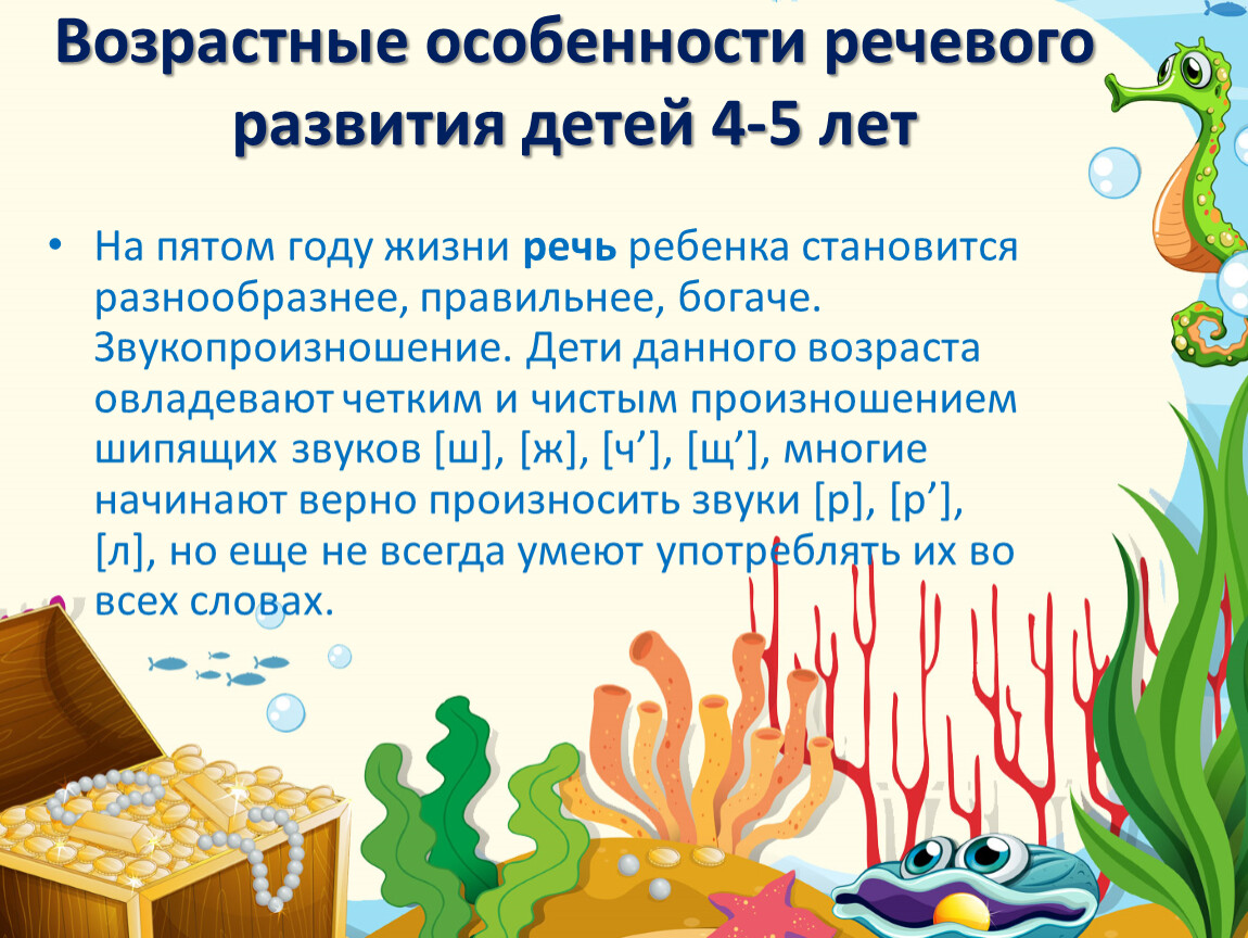 На пятом году жизни речь ребенка становится разнообразнее, правильнее, богаче. Звукопроизношение. Дети данного возраста овладевают четким и чистым произношением шипящих звуков [ш], [ж], [ч’], [щ’], многие начинают верно произносить звуки [р], [р’], [л], но еще не всегда умеют употреблять их во всех словах.