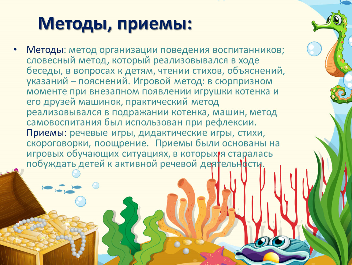 Методы: метод организации поведения воспитанников; словесный метод, который реализовывался в ходе беседы, в вопросах к детям, чтении стихов, объяснений, указаний – пояснений. Игровой метод: в сюрпризном моменте при внезапном появлении игрушки котенка и его друзей машинок, практический метод реализовывался в подражании котенка, машин, метод самовоспитания был использован при рефлексии. Приемы: речевые игры, дидактические игры, стихи, скороговорки, поощрение. Приемы были основаны на игровых обучающих ситуациях, в которых я старалась побуждать детей к активной речевой деятельности.