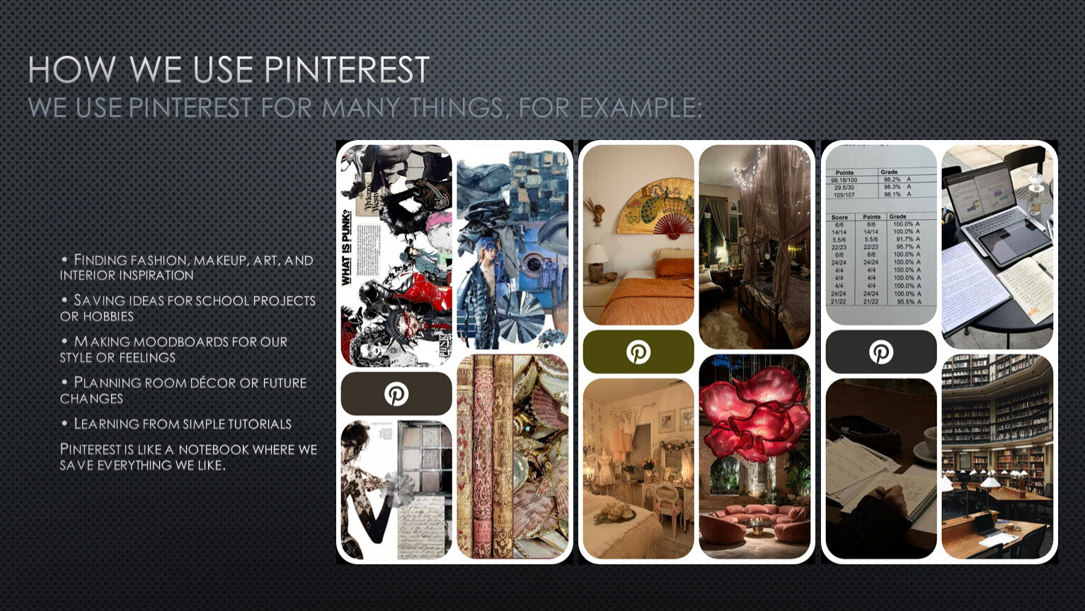 • Finding fashion, makeup, art, and interior inspiration • Saving ideas for school projects or hobbies • Making moodboards for our style or feelings • Planning room décor or future changes • Learning from simple tutorials Pinterest is like a notebook where we save everything we like.