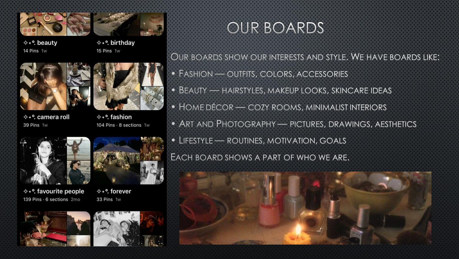 Our boards show our interests and style. We have boards like: • Fashion — outfits, colors, accessories • Beauty — hairstyles, makeup looks, skincare ideas • Home décor — cozy rooms, minimalist interiors • Art and Photography — pictures, drawings, aesthetics • Lifestyle — routines, motivation, goals Each board shows a part of who we are.