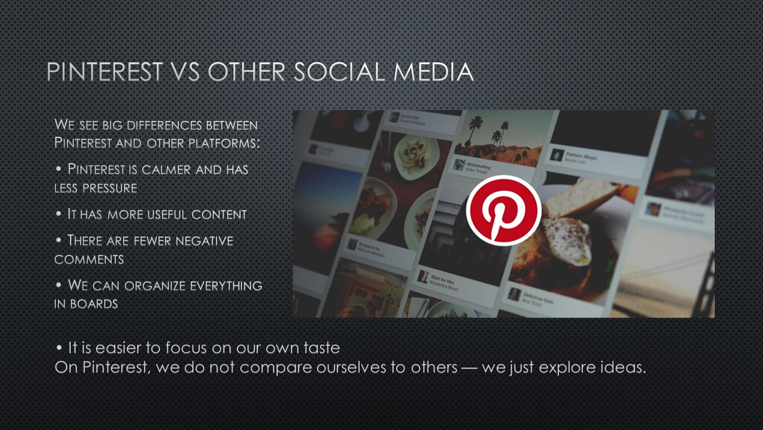 We see big differences between Pinterest and other platforms: • Pinterest is calmer and has less pressure • It has more useful content • There are fewer negative comments • We can organize everything in boards