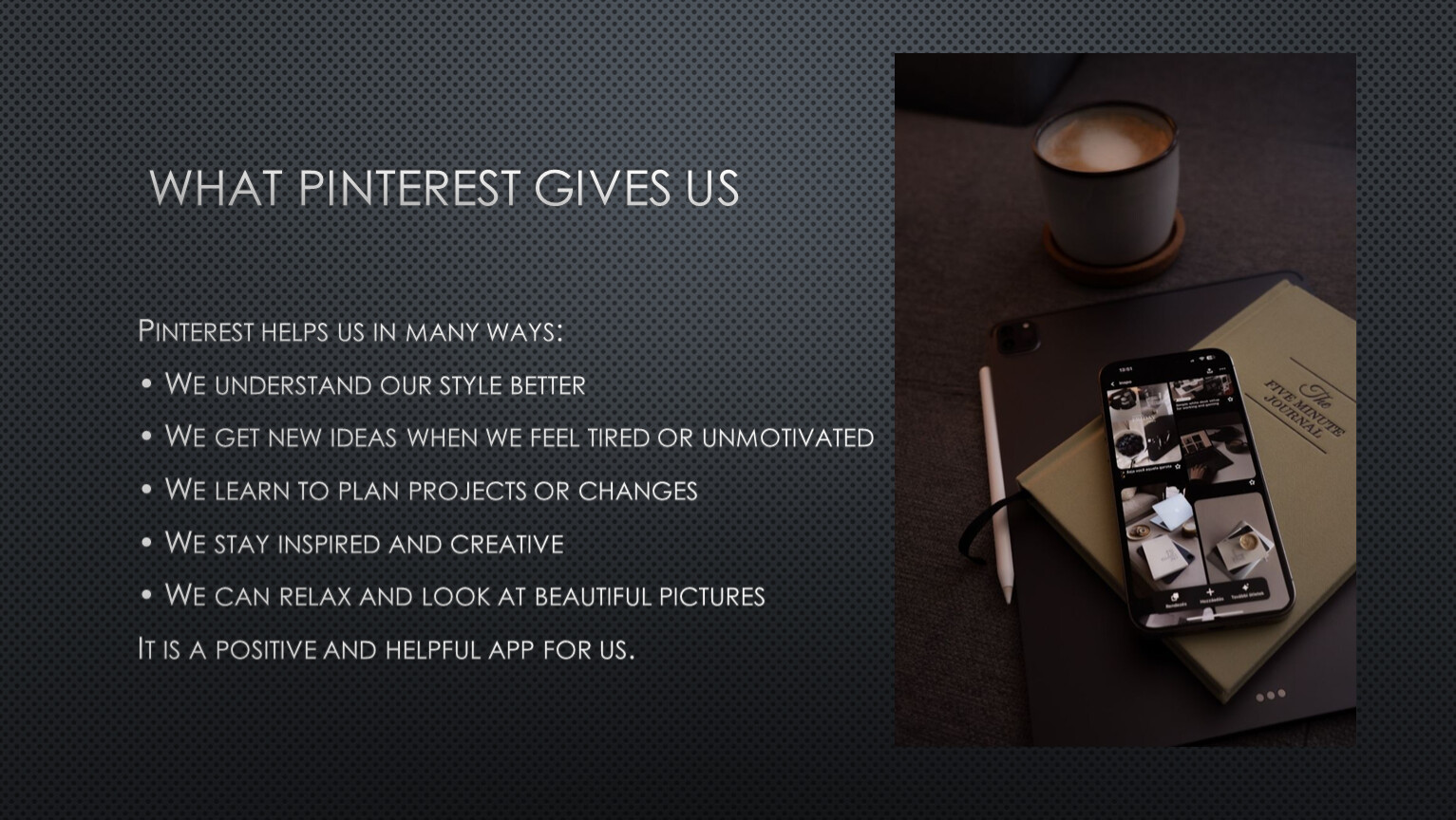 Pinterest helps us in many ways: • We understand our style better • We get new ideas when we feel tired or unmotivated • We learn to plan projects or changes • We stay inspired and creative • We can relax and look at beautiful pictures It is a positive and helpful app for us.