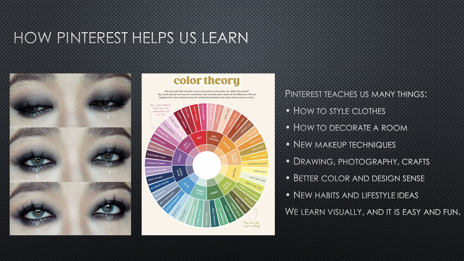 Pinterest teaches us many things: • How to style clothes • How to decorate a room • New makeup techniques • Drawing, photography, crafts • Better color and design sense • New habits and lifestyle ideas We learn visually, and it is easy and fun.