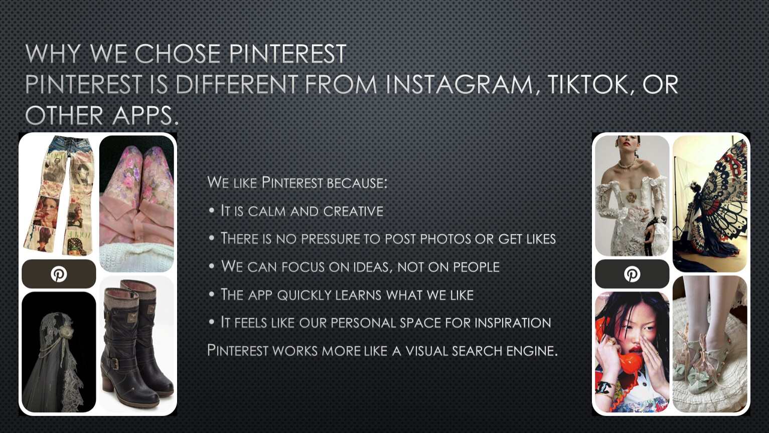We like Pinterest because: • It is calm and creative • There is no pressure to post photos or get likes • We can focus on ideas, not on people • The app quickly learns what we like • It feels like our personal space for inspiration Pinterest works more like a visual search engine.