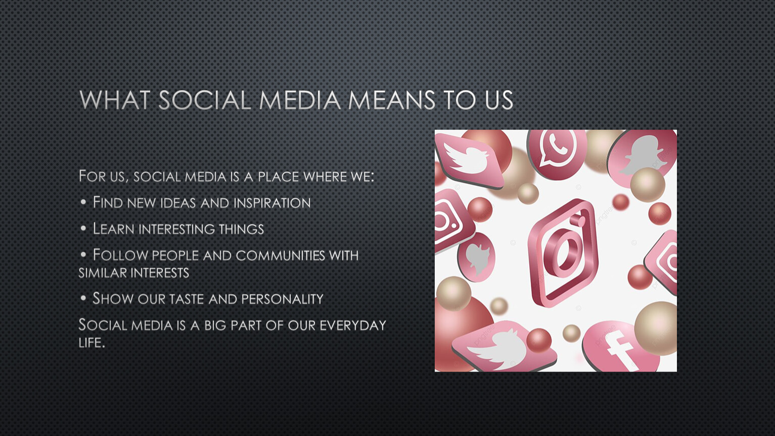 For us, social media is a place where we: • Find new ideas and inspiration • Learn interesting things • Follow people and communities with similar interests • Show our taste and personality Social media is a big part of our everyday life.