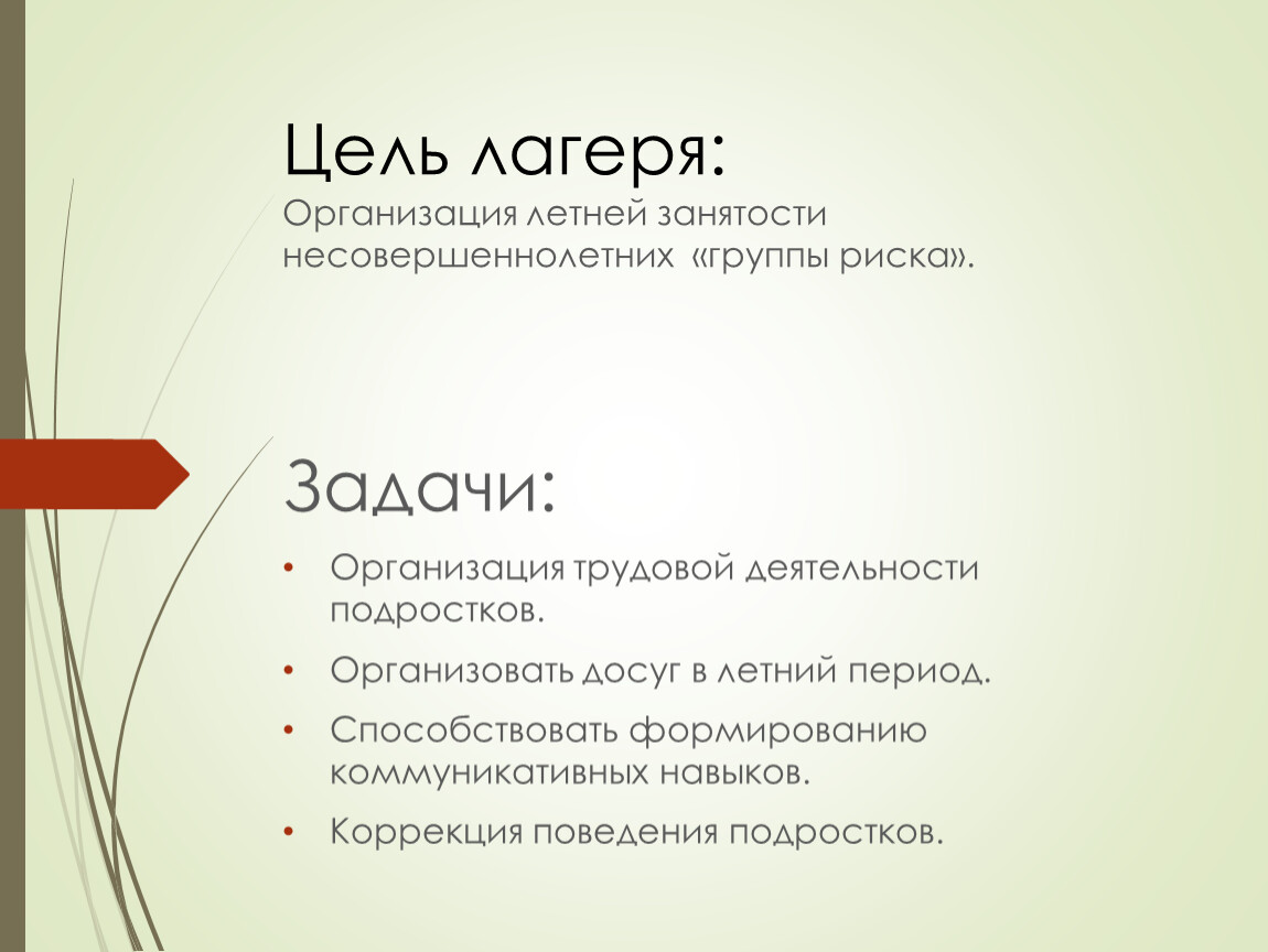 Цель лагеря:Организация летней занятости несовершеннолетних «группы риска».