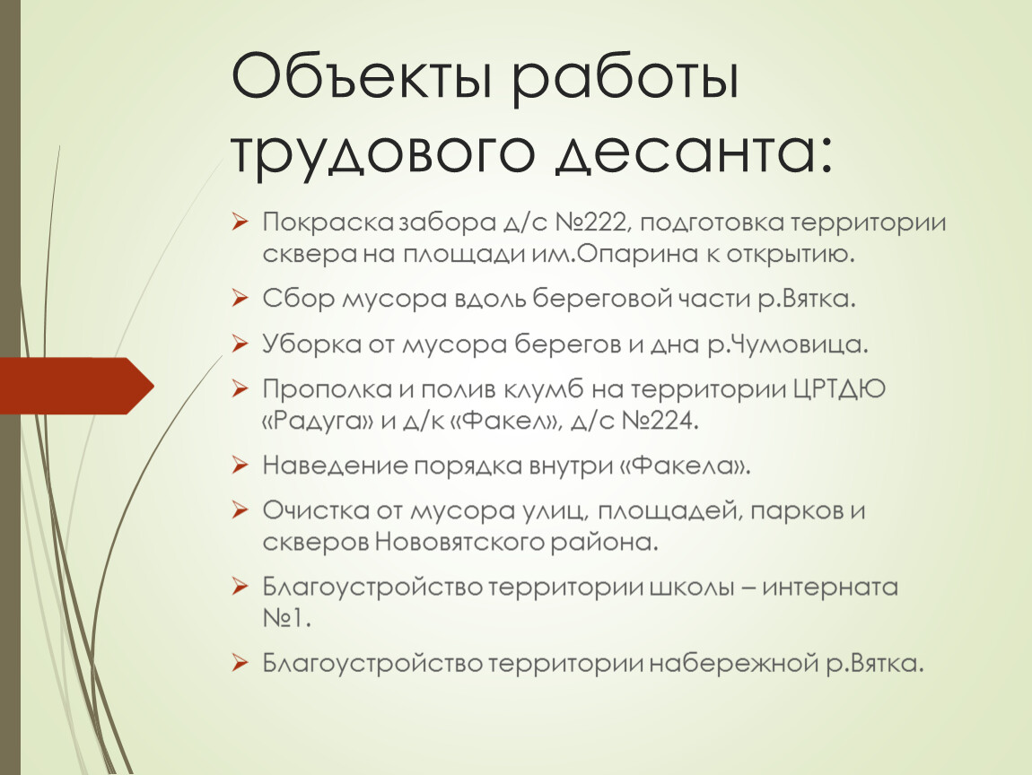 Объекты работы трудового десанта: