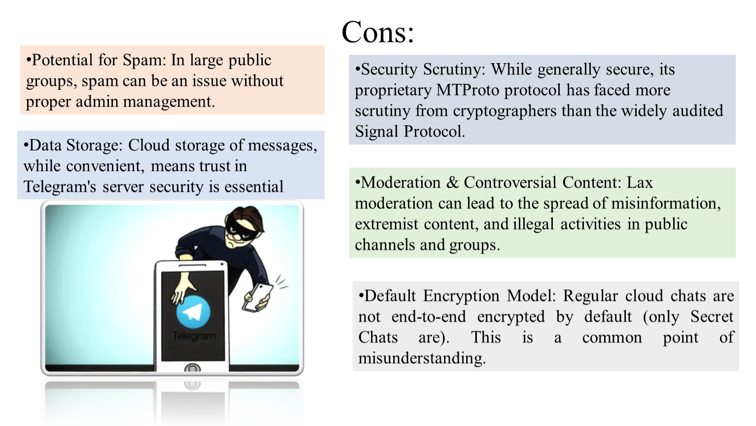 Data Storage: Cloud storage of messages, while convenient, means trust in Telegram's server security is essential
