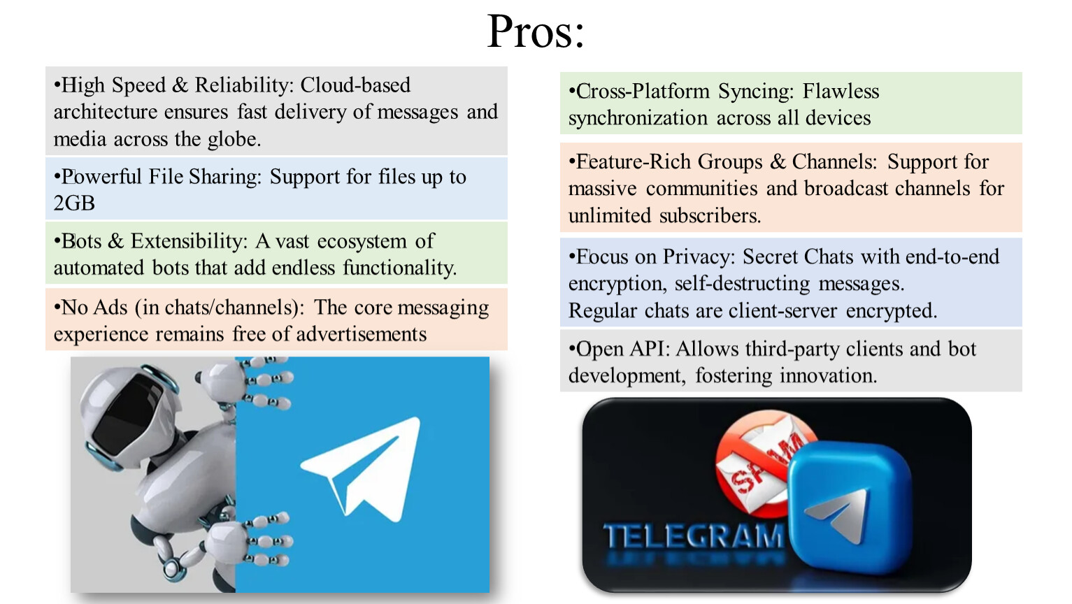 Feature-Rich Groups & Channels: Support for massive communities and broadcast channels for unlimited subscribers.