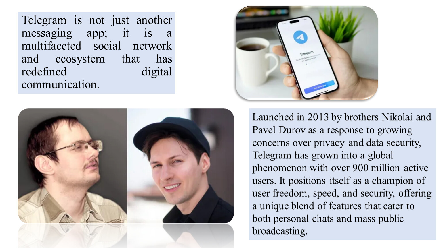 Launched in 2013 by brothers Nikolai and Pavel Durov as a response to growing concerns over privacy and data security, Telegram has grown into a global phenomenon with over 900 million active users. It positions itself as a champion of user freedom, speed, and security, offering a unique blend of features that cater to both personal chats and mass public broadcasting.