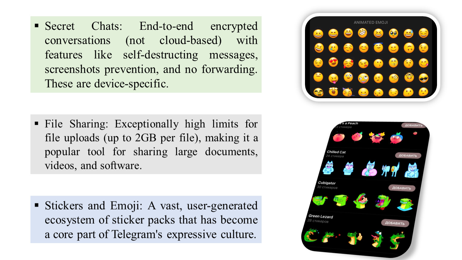 Stickers and Emoji: A vast, user-generated ecosystem of sticker packs that has become a core part of Telegram's expressive culture.