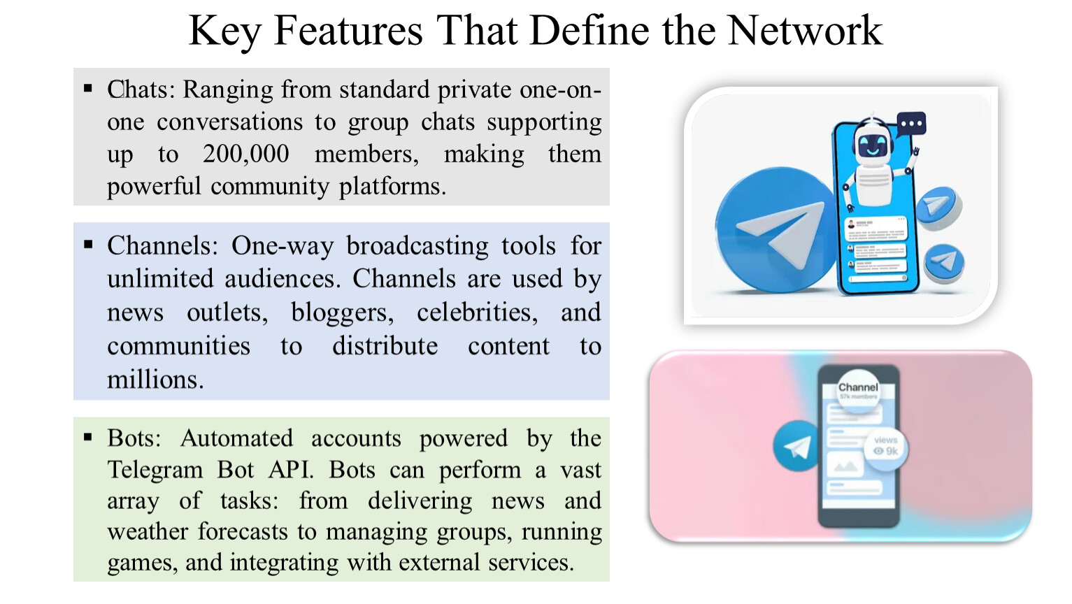 Bots: Automated accounts powered by the Telegram Bot API. Bots can perform a vast array of tasks: from delivering news and weather forecasts to managing groups, running games, and integrating with external services.