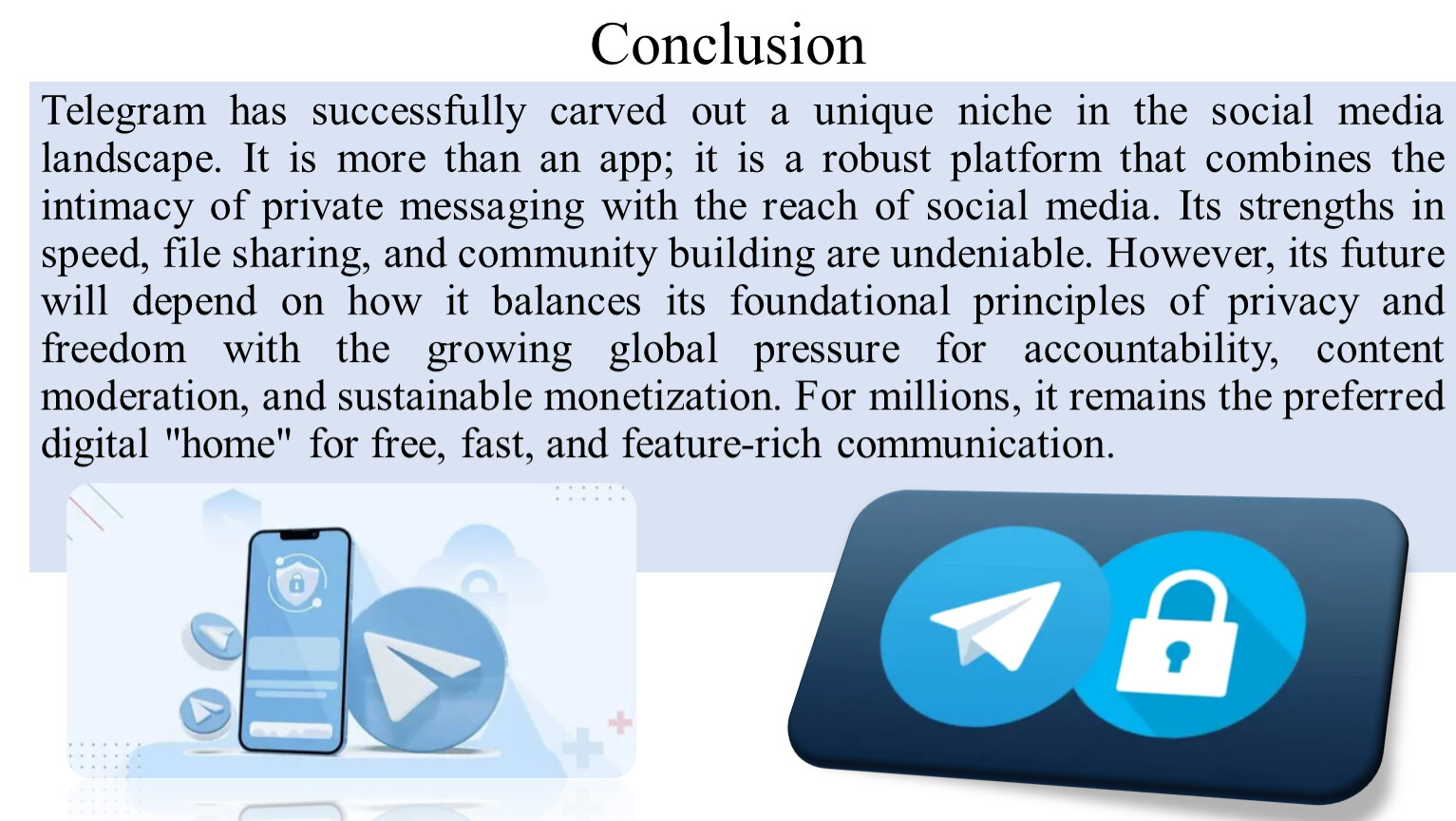 Telegram has successfully carved out a unique niche in the social media landscape. It is more than an app; it is a robust platform that combines the intimacy of private messaging with the reach of social media. Its strengths in speed, file sharing, and community building are undeniable. However, its future will depend on how it balances its foundational principles of privacy and freedom with the growing global pressure for accountability, content moderation, and sustainable monetization. For millions, it remains the preferred digital "home" for free, fast, and feature-rich communication.