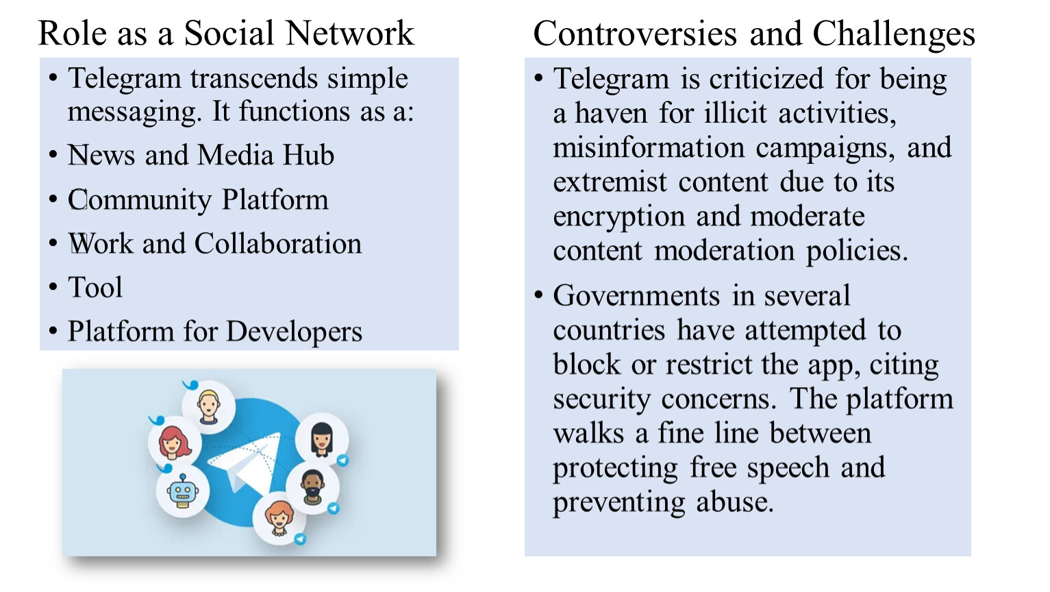 Moderation & Controversial Content: Lax moderation can lead to the spread of misinformation, extremist content, and illegal activities in public channels and groups.