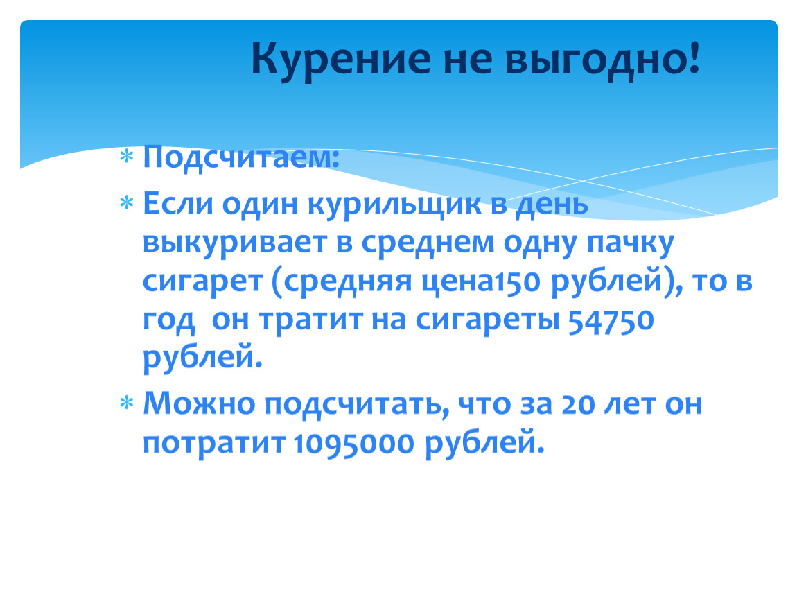 Если один курильщик в день выкуривает в среднем одну пачку сигарет (средняя цена150 рублей), то в год он тратит на сигареты 54750 рублей.