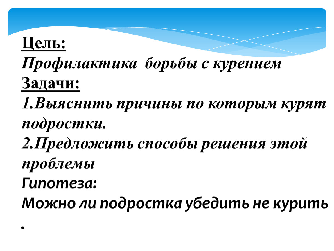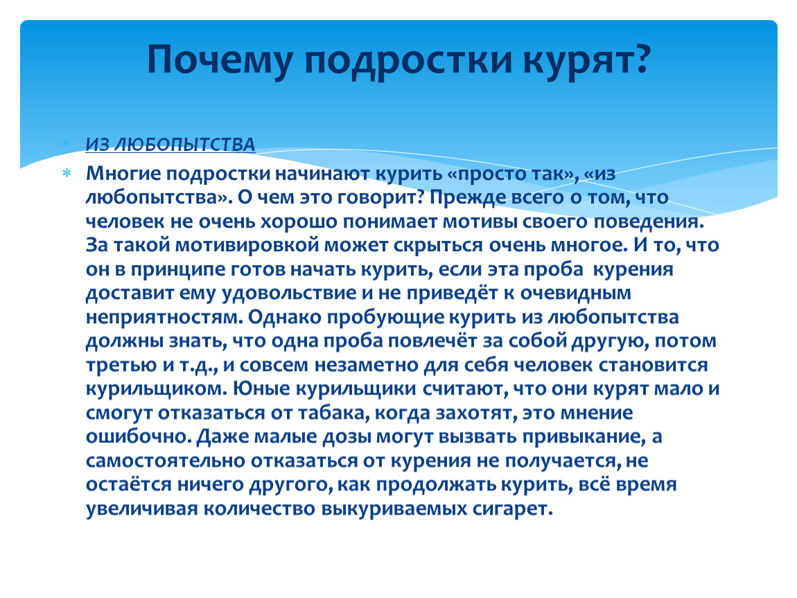 Многие подростки начинают курить «просто так», «из любопытства». О чем это говорит? Прежде всего о том, что человек не очень хорошо понимает мотивы своего поведения. За такой мотивировкой может скрыться очень многое. И то, что он в принципе готов начать курить, если эта проба курения доставит ему удовольствие и не приведёт к очевидным неприятностям. Однако пробующие курить из любопытства должны знать, что одна проба повлечёт за собой другую, потом третью и т.д., и совсем незаметно для себя человек становится курильщиком. Юные курильщики считают, что они курят мало и смогут отказаться от табака, когда захотят, это мнение ошибочно. Даже малые дозы могут вызвать привыкание, а самостоятельно отказаться от курения не получается, не остаётся ничего другого, как продолжать курить, всё время увеличивая количество выкуриваемых сигарет.