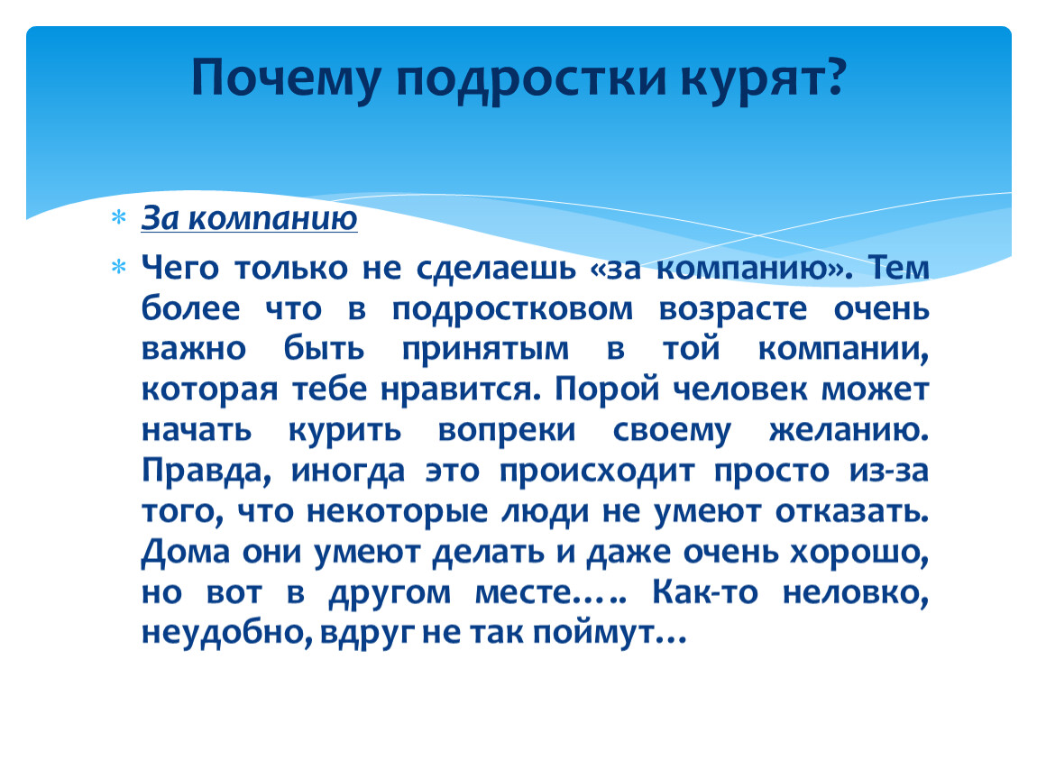 Чего только не сделаешь «за компанию». Тем более что в подростковом возрасте очень важно быть принятым в той компании, которая тебе нравится. Порой человек может начать курить вопреки своему желанию. Правда, иногда это происходит просто из-за того, что некоторые люди не умеют отказать. Дома они умеют делать и даже очень хорошо, но вот в другом месте….. Как-то неловко, неудобно, вдруг не так поймут…