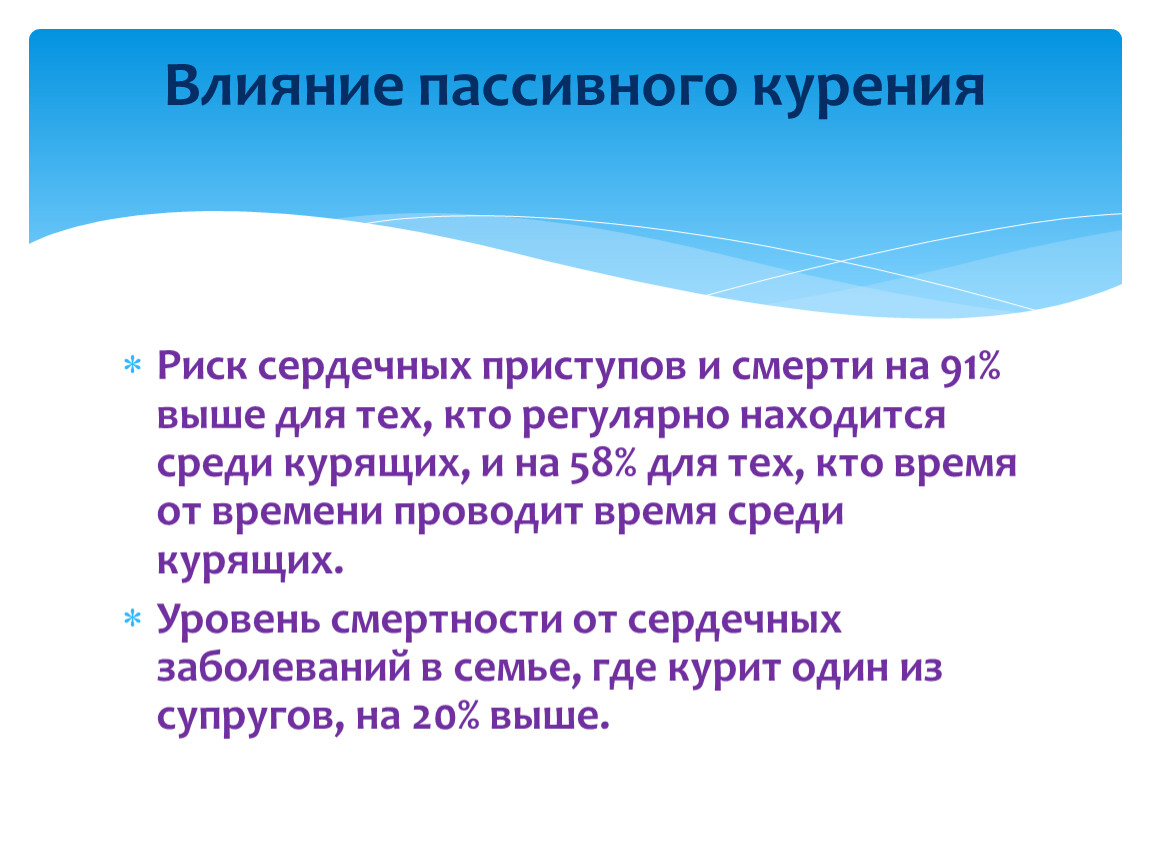 Риск сердечных приступов и смерти на 91% выше для тех, кто регулярно находится среди курящих, и на 58% для тех, кто время от времени проводит время среди курящих.