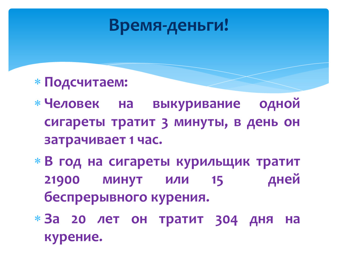 Человек на выкуривание одной сигареты тратит 3 минуты, в день он затрачивает 1 час.