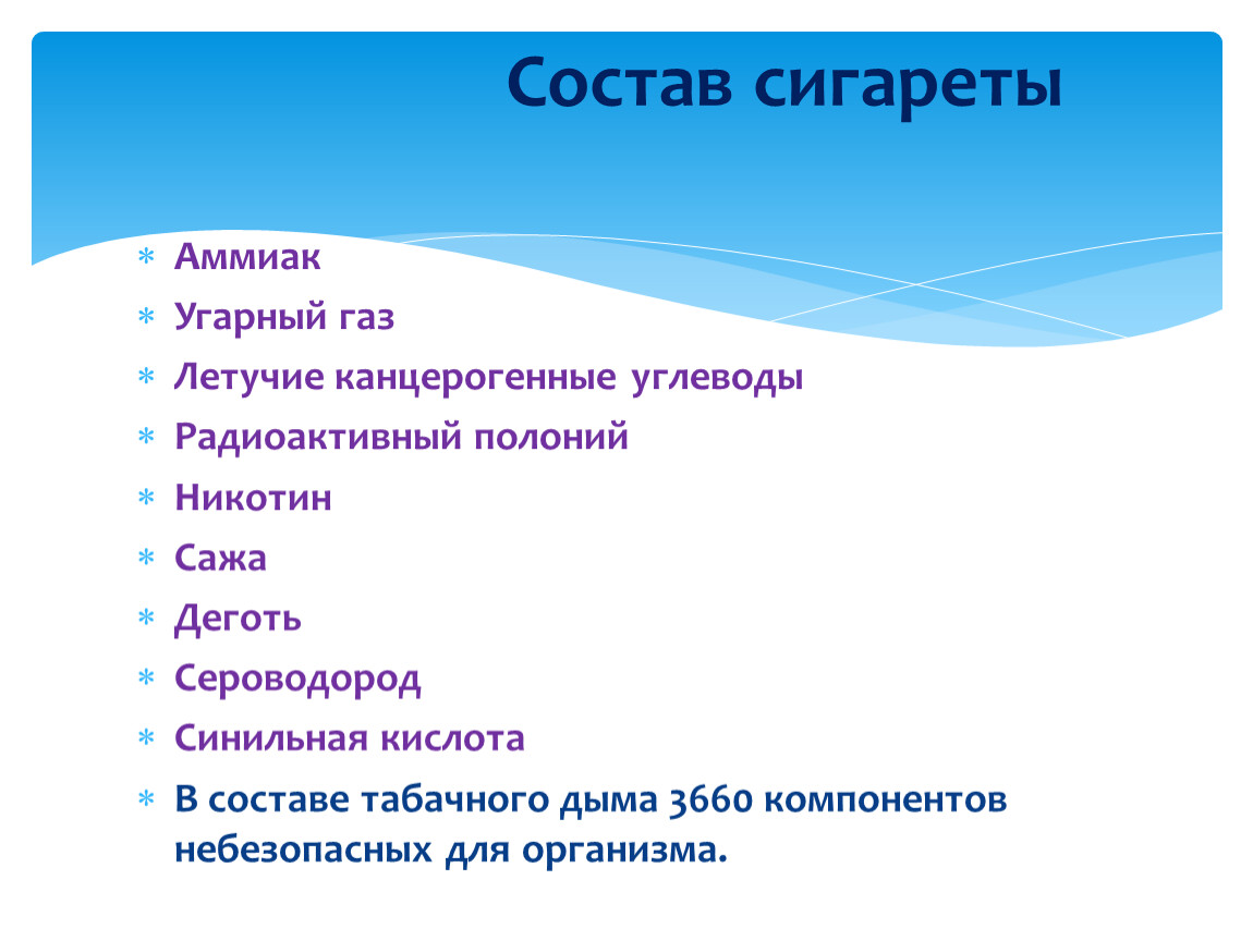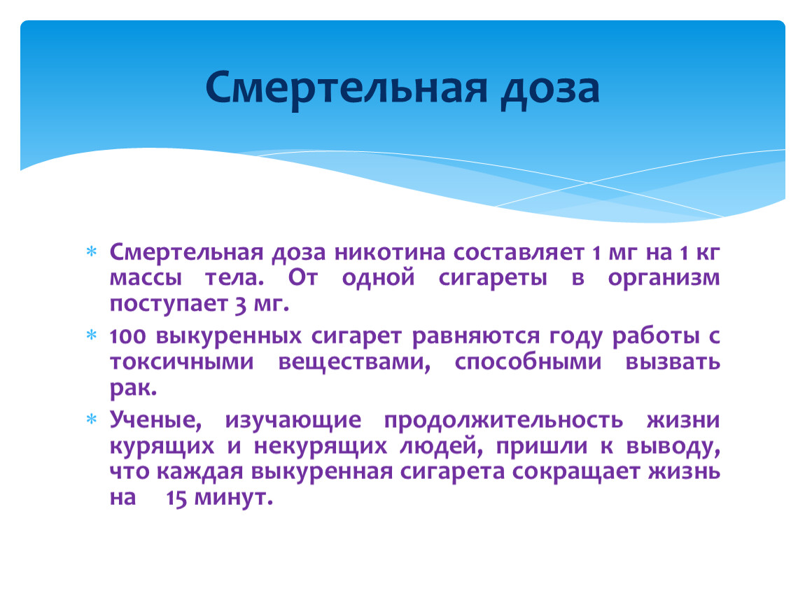 Смертельная доза никотина составляет 1 мг на 1 кг массы тела. От одной сигареты в организм поступает 3 мг.