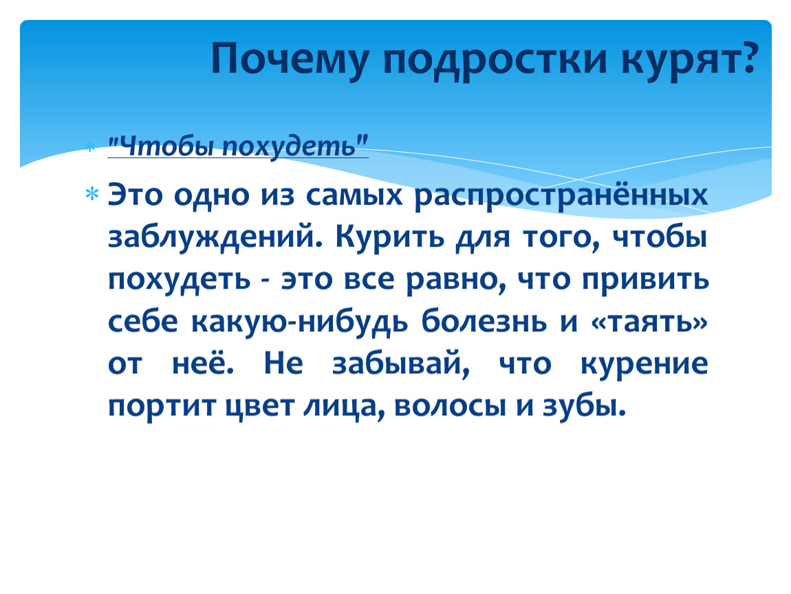 Это одно из самых распространённых заблуждений. Курить для того, чтобы похудеть - это все равно, что привить себе какую-нибудь болезнь и «таять» от неё. Не забывай, что курение портит цвет лица, волосы и зубы.