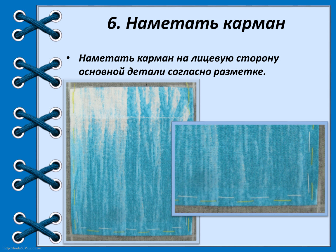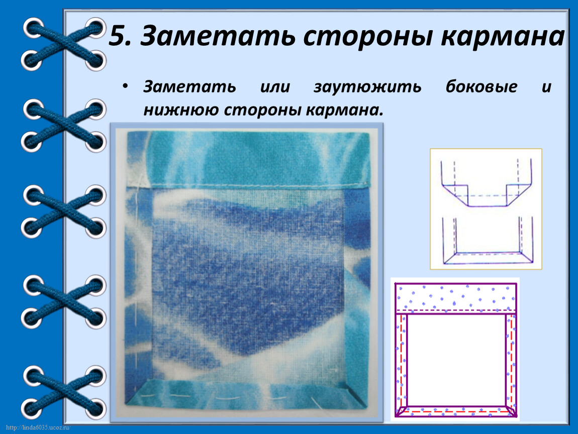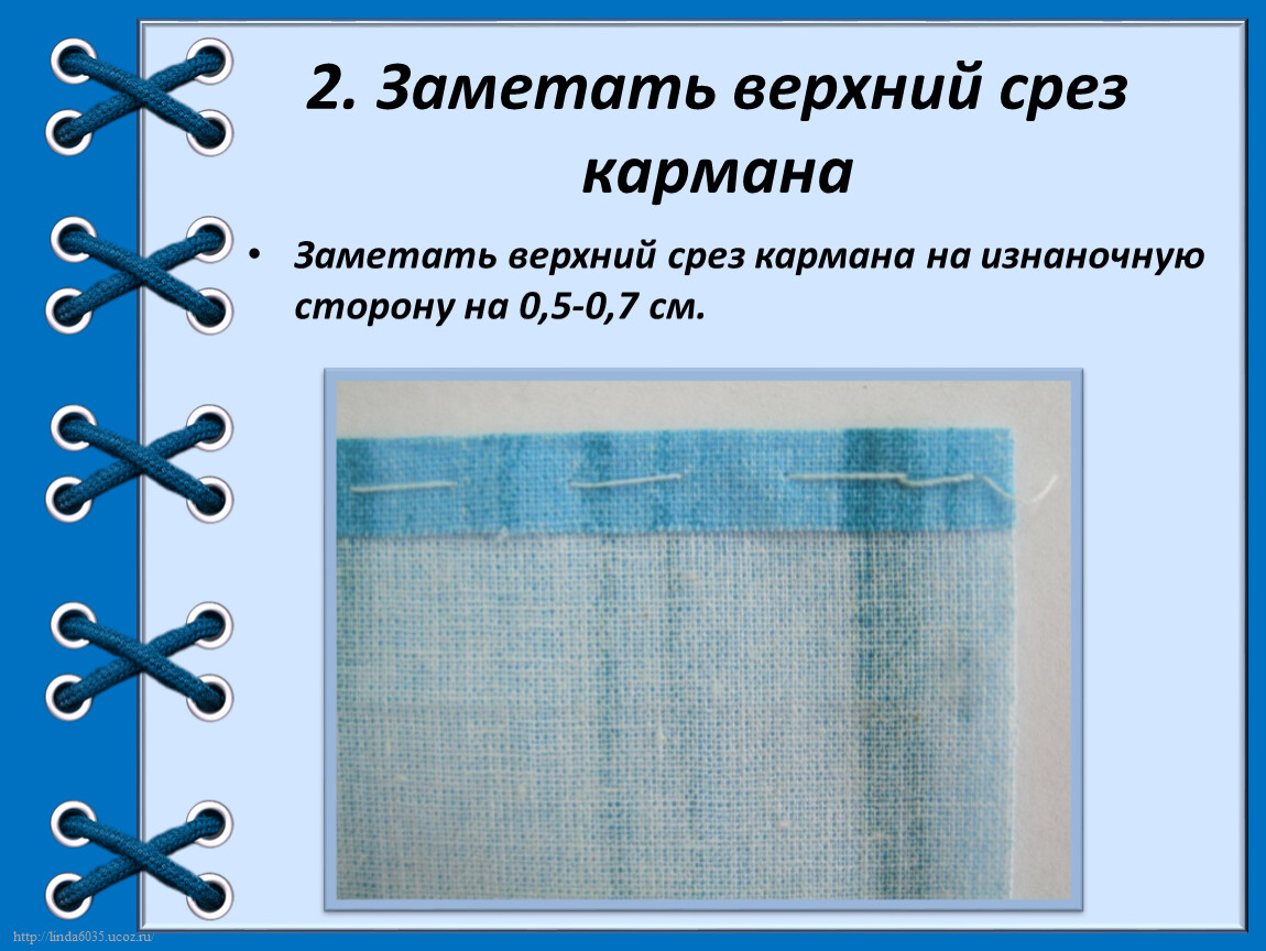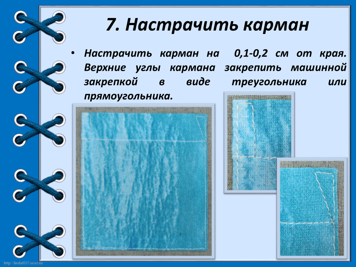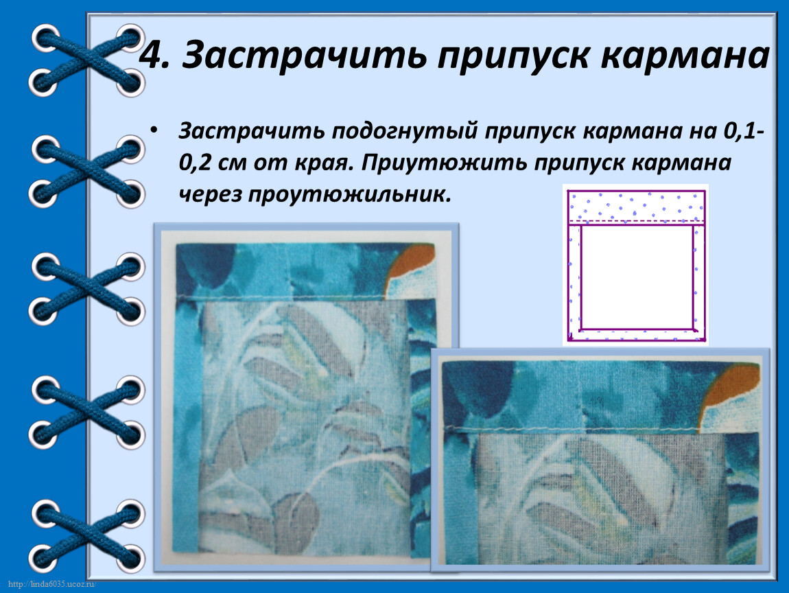 Настрачить карман на 0,1-0,2 см от края. Верхние углы кармана закрепить машинной закрепкой в виде треугольника или прямоугольника.