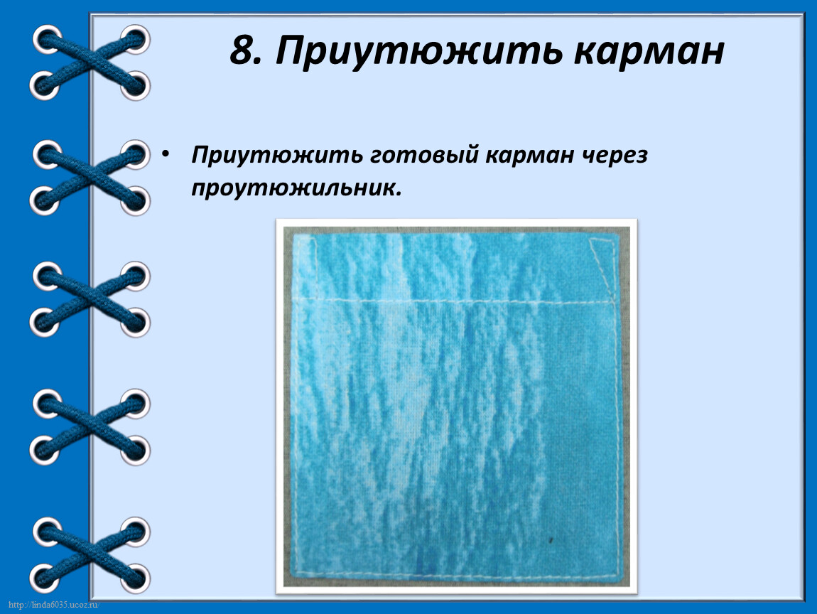 Застрачить подогнутый припуск кармана на 0,1-0,2 см от края. Приутюжить припуск кармана через проутюжильник.
