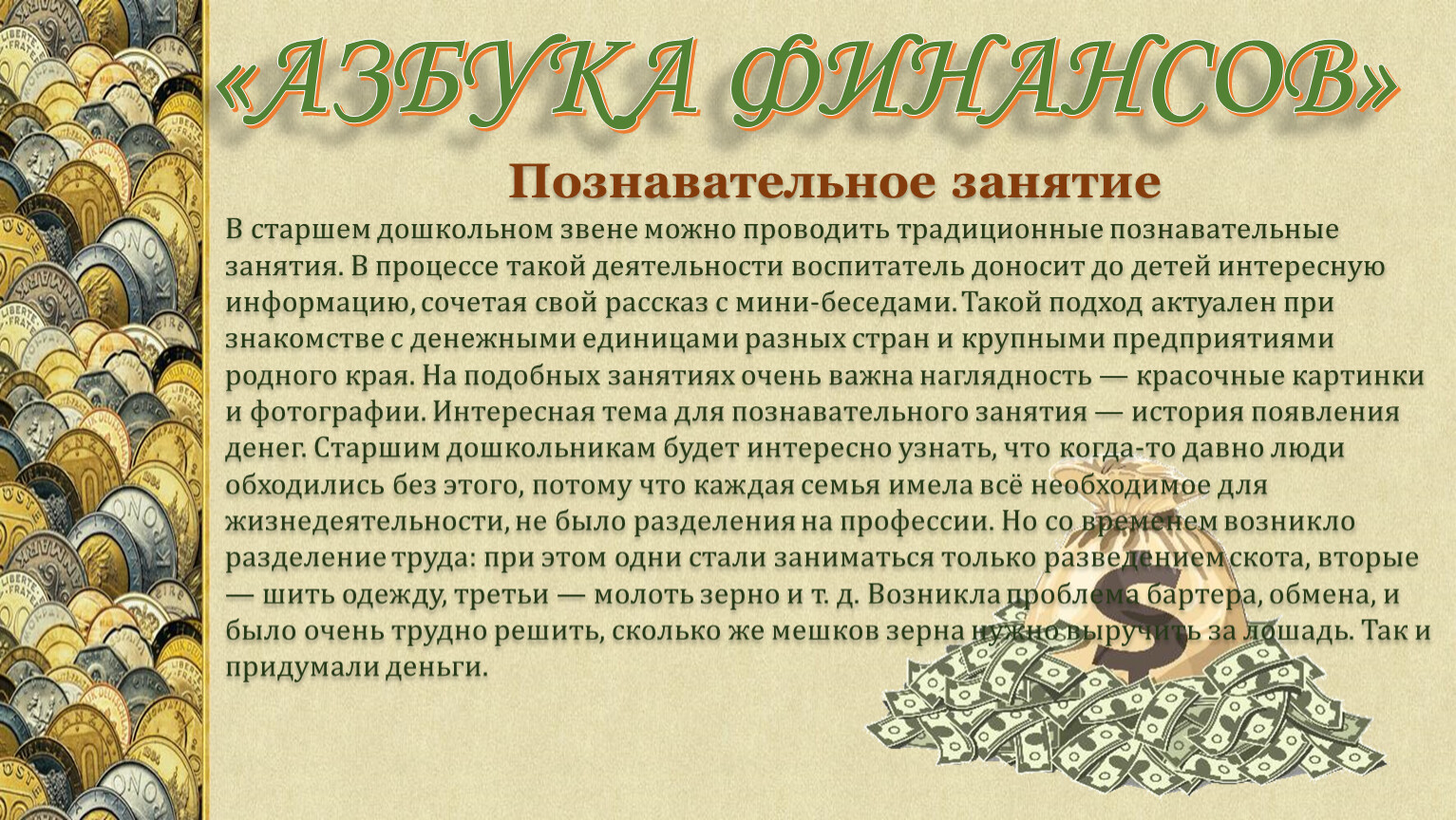 В старшем дошкольном звене можно проводить традиционные познавательные занятия. В процессе такой деятельности воспитатель доносит до детей интересную информацию, сочетая свой рассказ с мини-беседами. Такой подход актуален при знакомстве с денежными единицами разных стран и крупными предприятиями родного края. На подобных занятиях очень важна наглядность — красочные картинки и фотографии. Интересная тема для познавательного занятия — история появления денег. Старшим дошкольникам будет интересно узнать, что когда-то давно люди обходились без этого, потому что каждая семья имела всё необходимое для жизнедеятельности, не было разделения на профессии. Но со временем возникло разделение труда: при этом одни стали заниматься только разведением скота, вторые — шить одежду, третьи — молоть зерно и т. д. Возникла проблема бартера, обмена, и было очень трудно решить, сколько же мешков зерна нужно выручить за лошадь. Так и придумали деньги.