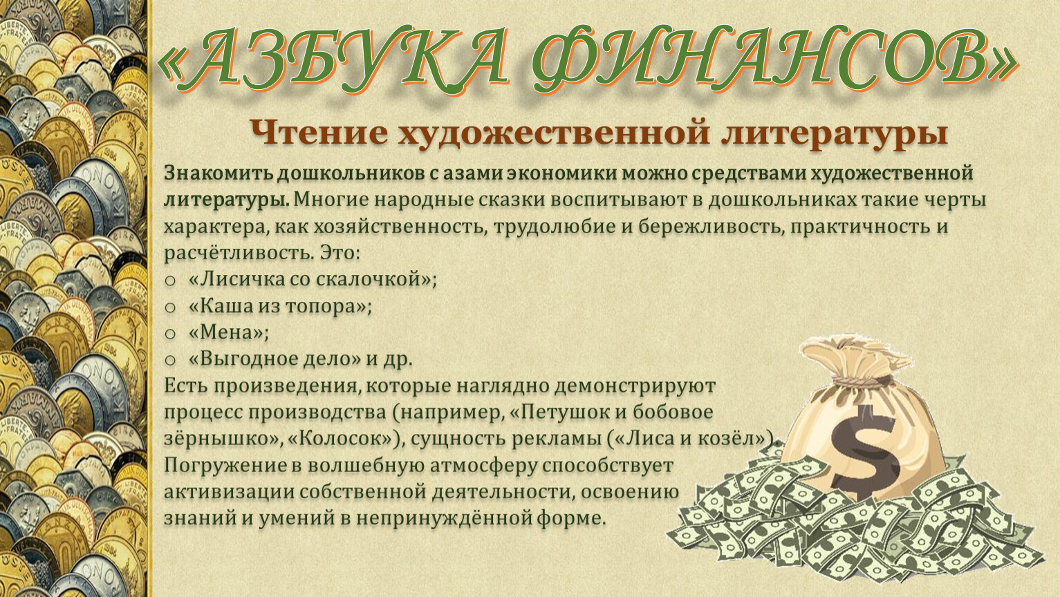 Знакомить дошкольников с азами экономики можно средствами художественной литературы. Многие народные сказки воспитывают в дошкольниках такие черты характера, как хозяйственность, трудолюбие и бережливость, практичность и расчётливость. Это: