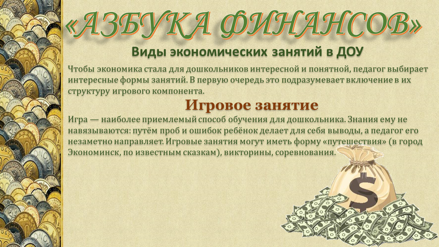 Чтобы экономика стала для дошкольников интересной и понятной, педагог выбирает интересные формы занятий. В первую очередь это подразумевает включение в их структуру игрового компонента.