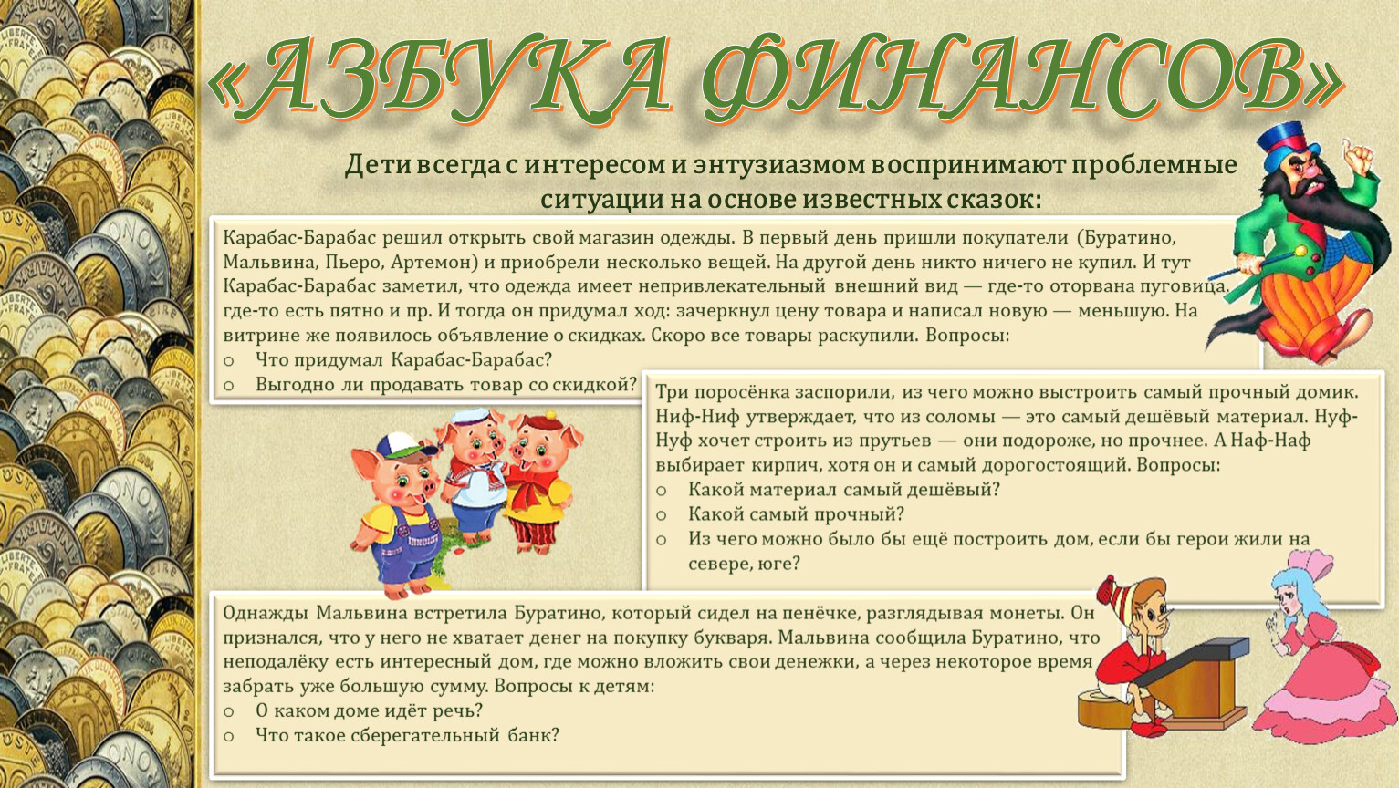 Однажды Мальвина встретила Буратино, который сидел на пенёчке, разглядывая монеты. Он признался, что у него не хватает денег на покупку букваря. Мальвина сообщила Буратино, что неподалёку есть интересный дом, где можно вложить свои денежки, а через некоторое время забрать уже большую сумму. Вопросы к детям: