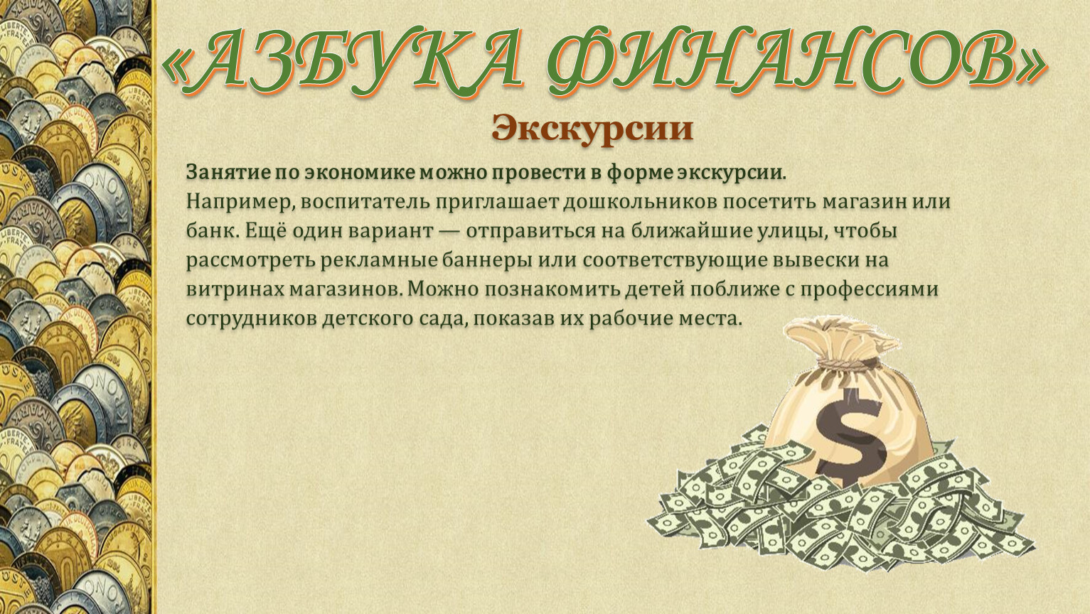 Занятие по экономике можно провести в форме экскурсии. Например, воспитатель приглашает дошкольников посетить магазин или банк. Ещё один вариант — отправиться на ближайшие улицы, чтобы рассмотреть рекламные баннеры или соответствующие вывески на витринах магазинов. Можно познакомить детей поближе с профессиями сотрудников детского сада, показав их рабочие места.