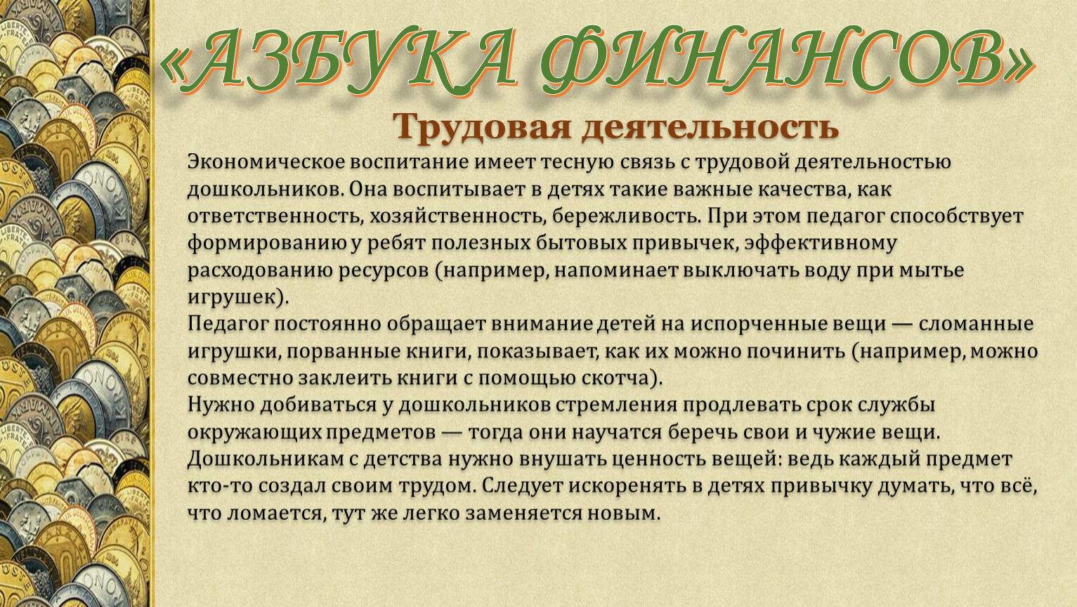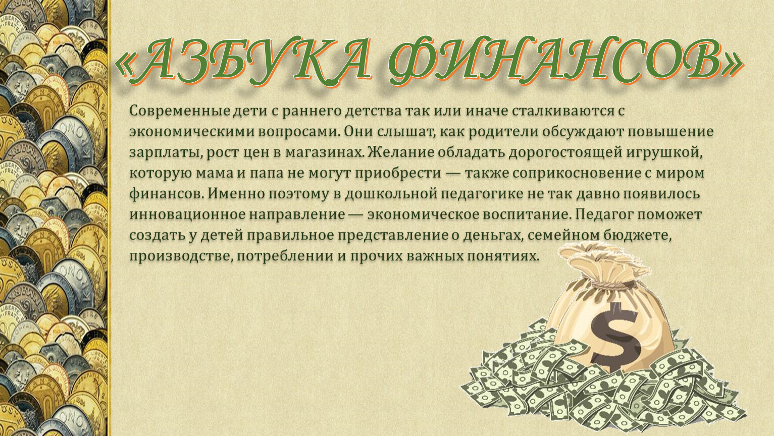 Современные дети с раннего детства так или иначе сталкиваются с экономическими вопросами. Они слышат, как родители обсуждают повышение зарплаты, рост цен в магазинах. Желание обладать дорогостоящей игрушкой, которую мама и папа не могут приобрести — также соприкосновение с миром финансов. Именно поэтому в дошкольной педагогике не так давно появилось инновационное направление — экономическое воспитание. Педагог поможет создать у детей правильное представление о деньгах, семейном бюджете, производстве, потреблении и прочих важных понятиях.