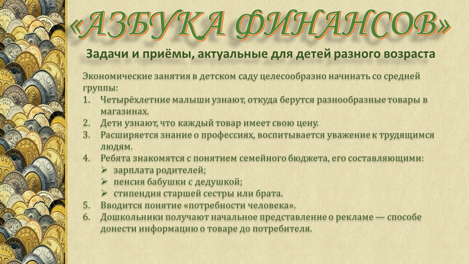 Экономические занятия в детском саду целесообразно начинать со средней группы: