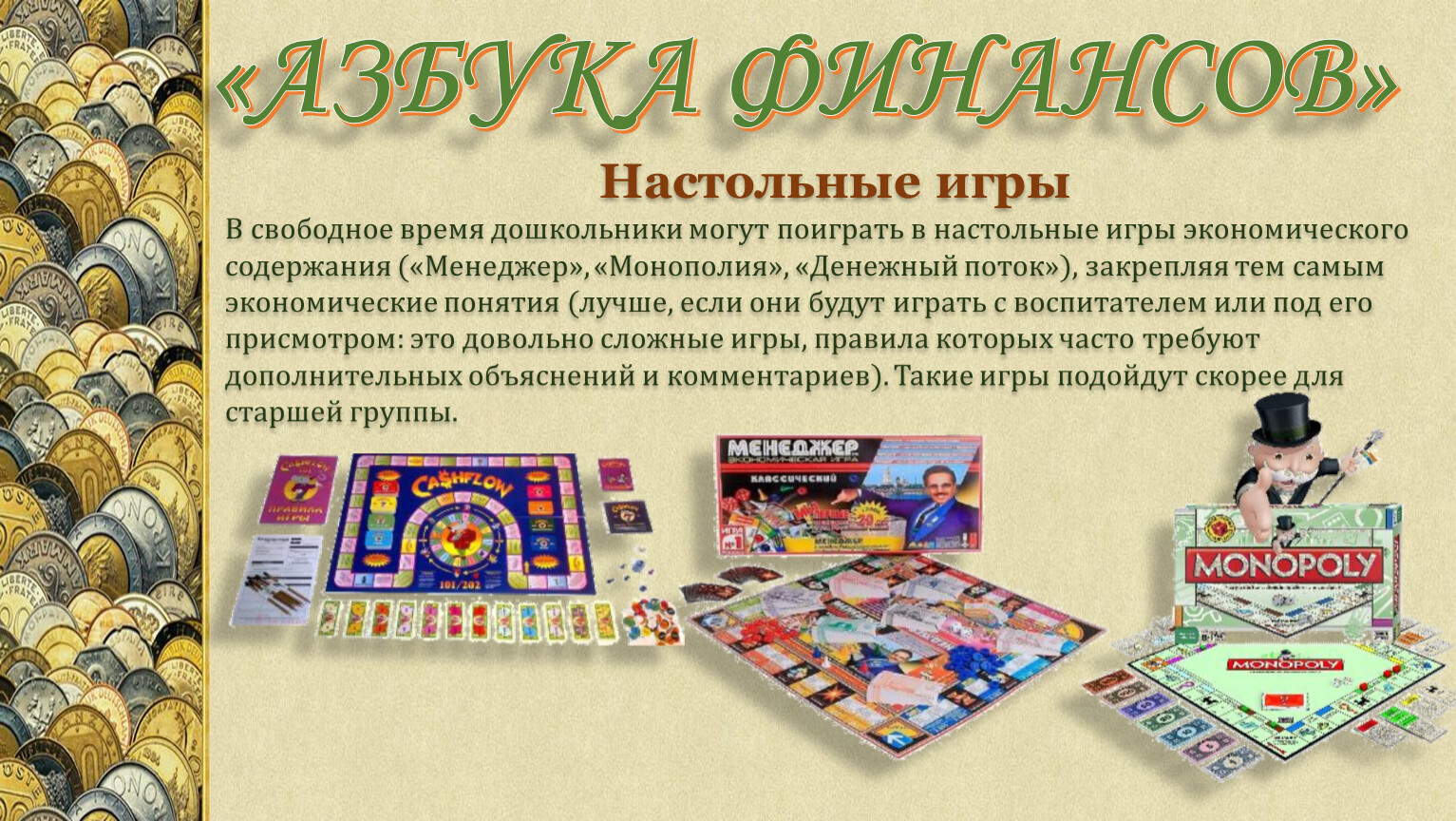 В свободное время дошкольники могут поиграть в настольные игры экономического содержания («Менеджер», «Монополия», «Денежный поток»), закрепляя тем самым экономические понятия (лучше, если они будут играть с воспитателем или под его присмотром: это довольно сложные игры, правила которых часто требуют дополнительных объяснений и комментариев). Такие игры подойдут скорее для старшей группы.