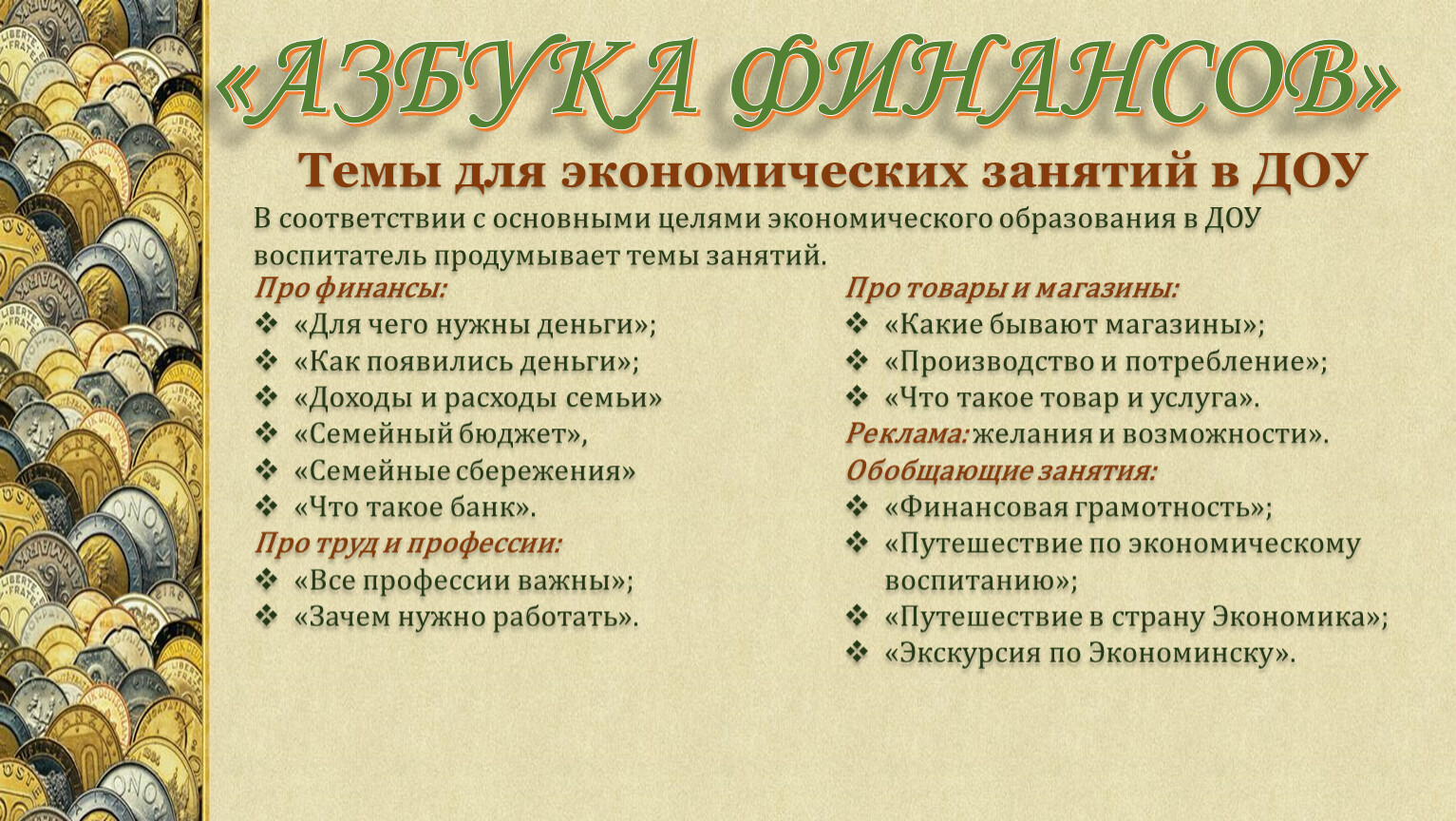 Темы для экономических занятий в ДОУ
