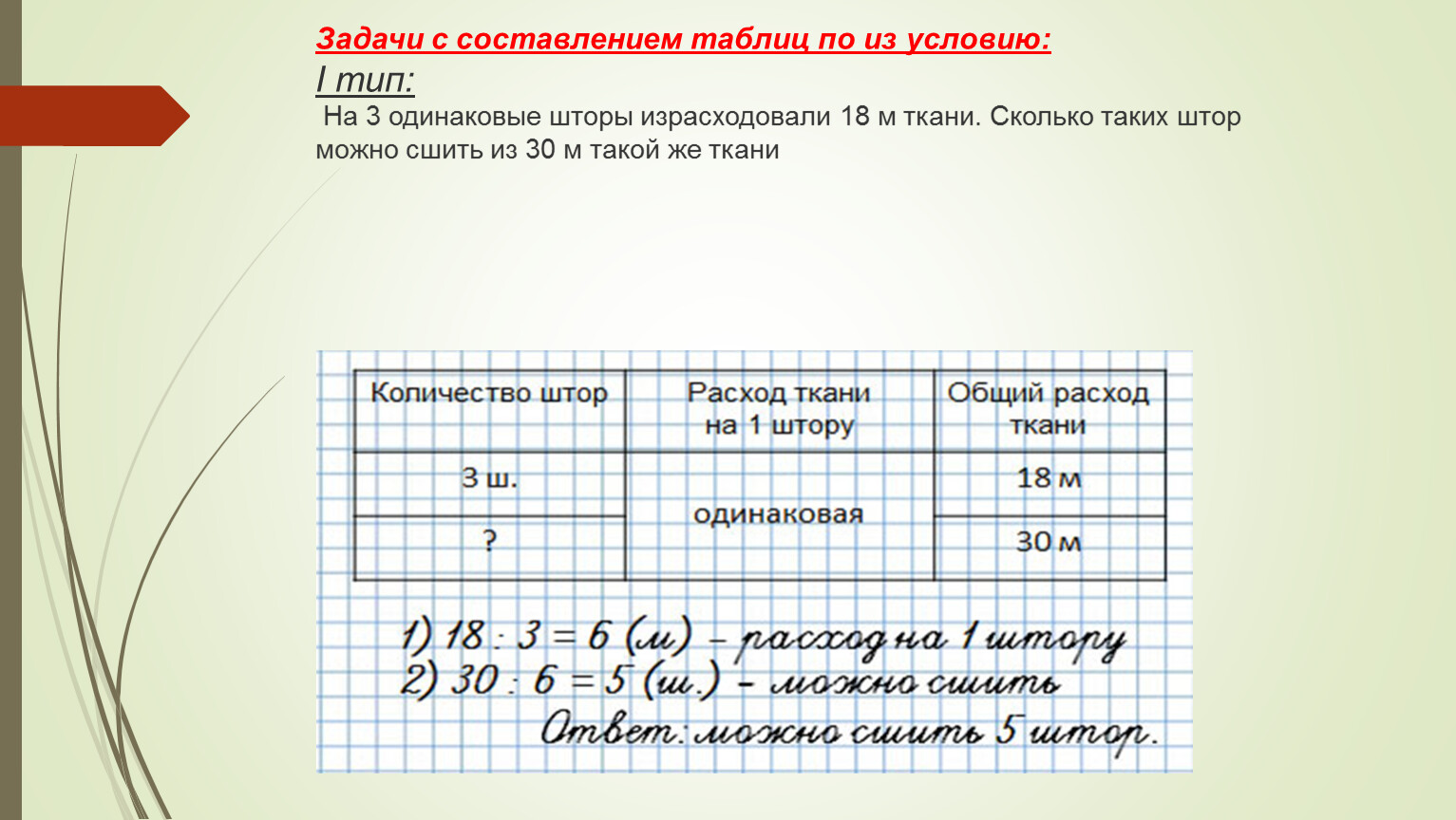 На 3 одинаковые шторы израсходовали 18 м ткани. Сколько таких штор можно сшить из 30 м такой же ткани