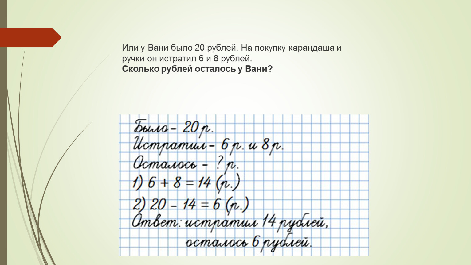 Или у Вани было 20 рублей. На покупку карандаша и ручки он истратил 6 и 8 рублей.