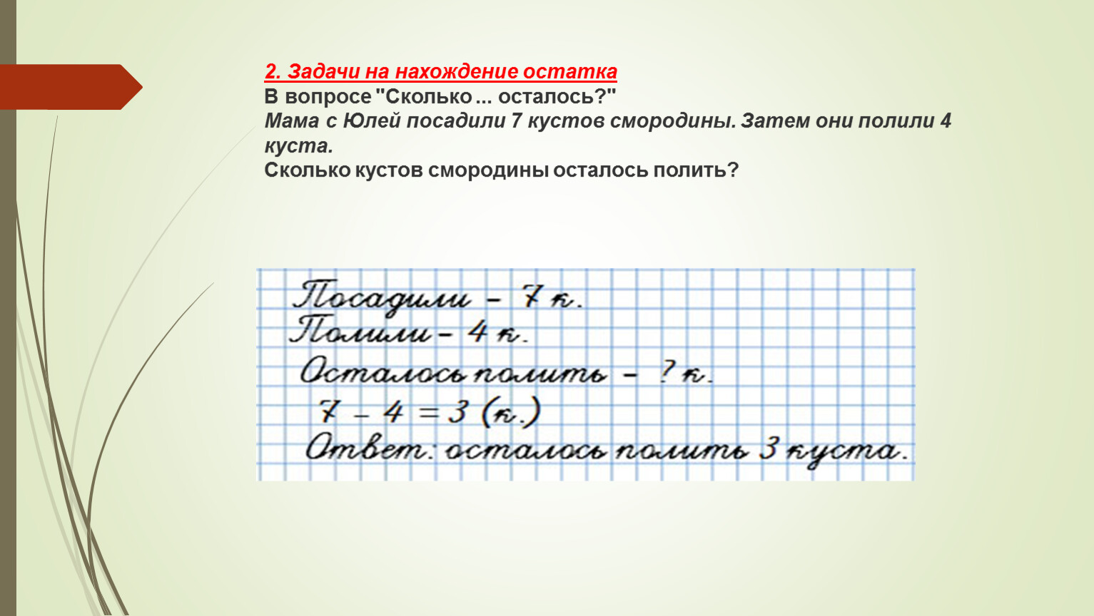 Мама с Юлей посадили 7 кустов смородины. Затем они полили 4 куста.