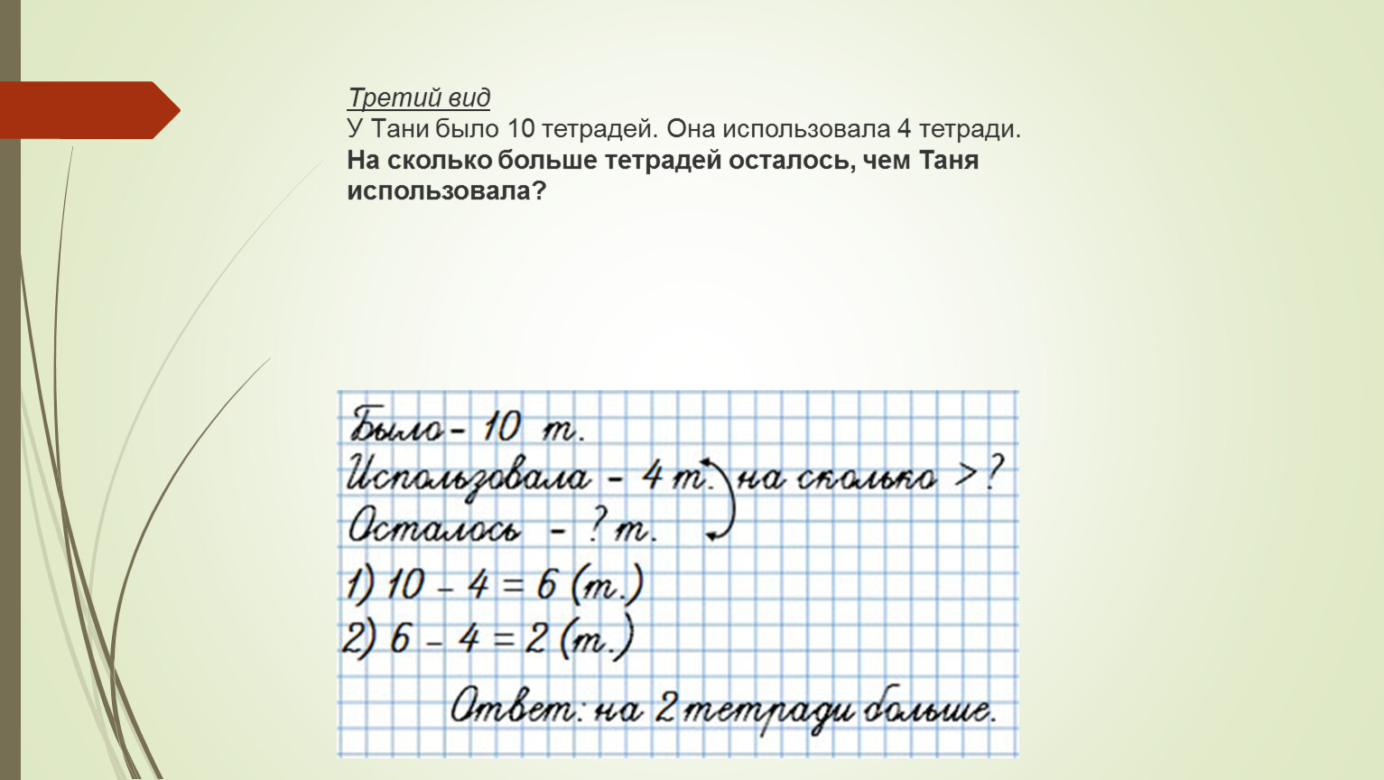 У Тани было 10 тетрадей. Она использовала 4 тетради.