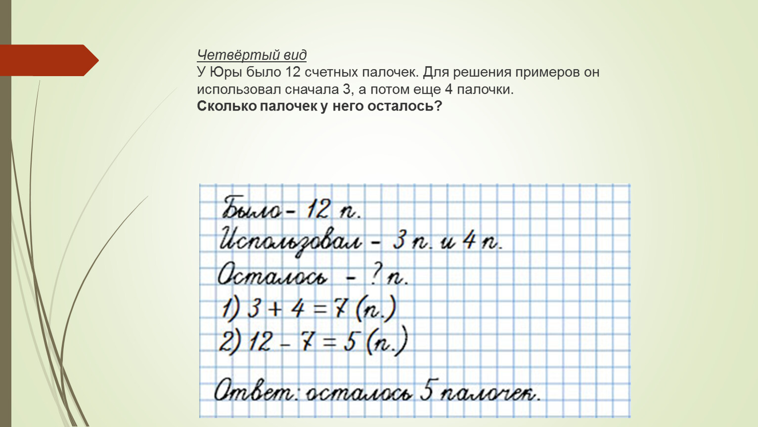 У Юры было 12 счетных палочек. Для решения примеров он использовал сначала 3, а потом еще 4 палочки.