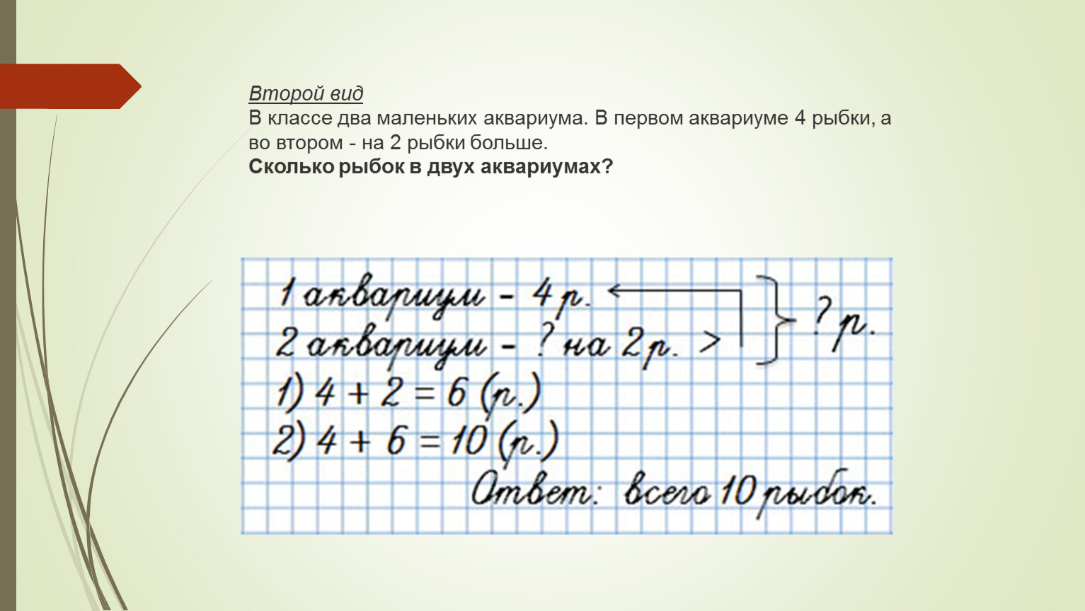 В классе два маленьких аквариума. В первом аквариуме 4 рыбки, а во втором - на 2 рыбки больше.