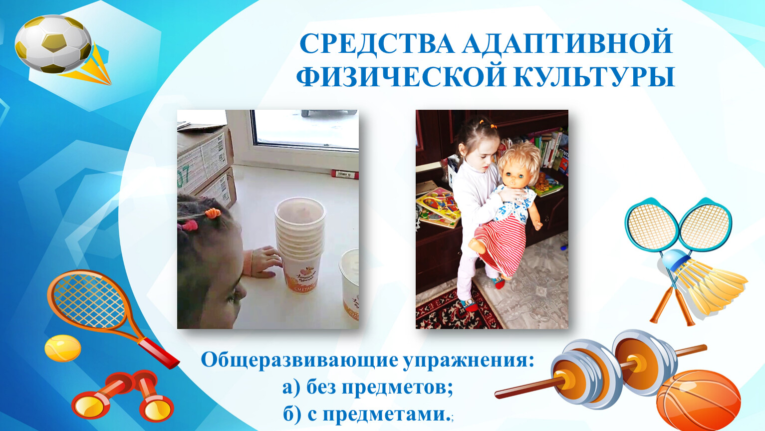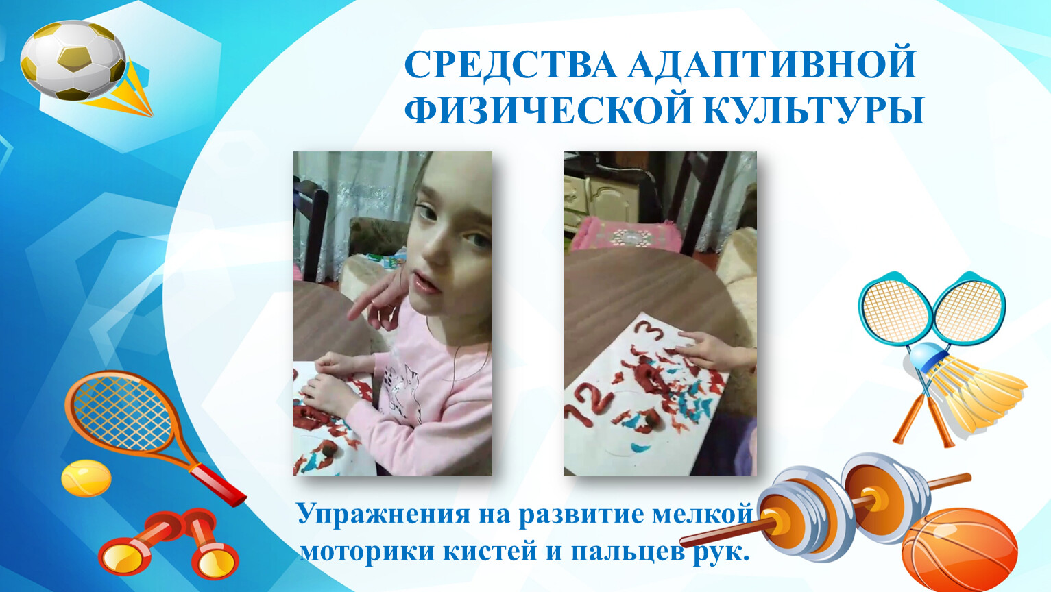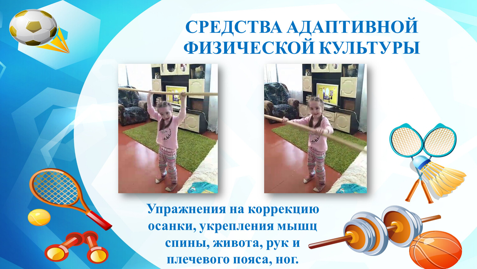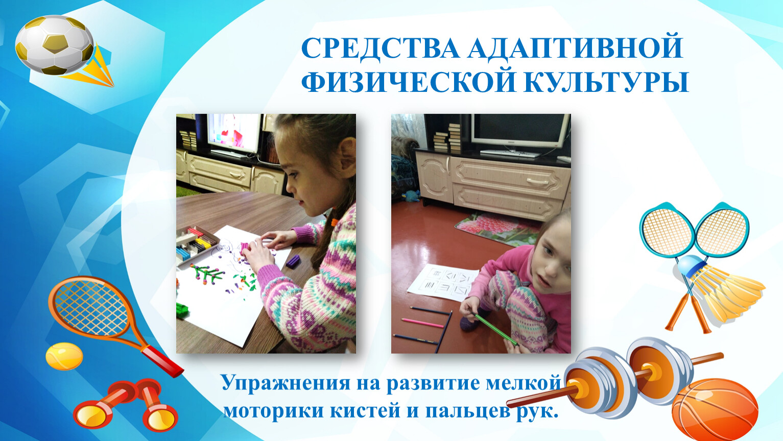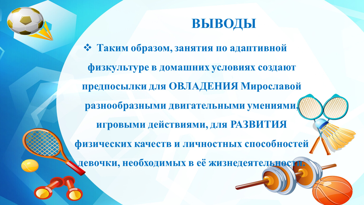 Таким образом, занятия по адаптивной физкультуре в домашних условиях создают предпосылки для ОВЛАДЕНИЯ Мирославой разнообразными двигательными умениями, игровыми действиями, для РАЗВИТИЯ физических качеств и личностных способностей девочки, необходимых в её жизнедеятельности.