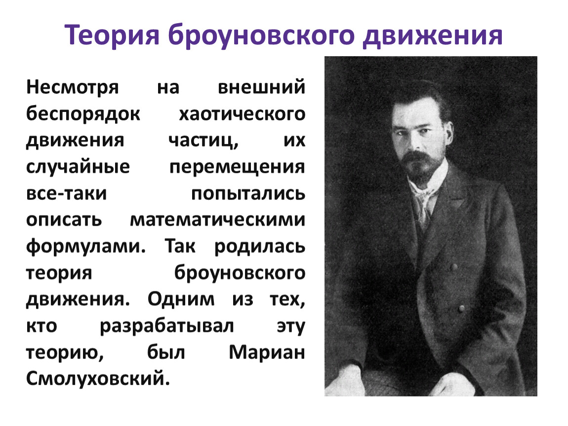 Несмотря на внешний беспорядок хаотического движения частиц, их случайные перемещения все-таки попытались описать математическими формулами. Так родилась теория броуновского движения. Одним из тех, кто разрабатывал эту теорию, был Мариан Смолуховский.