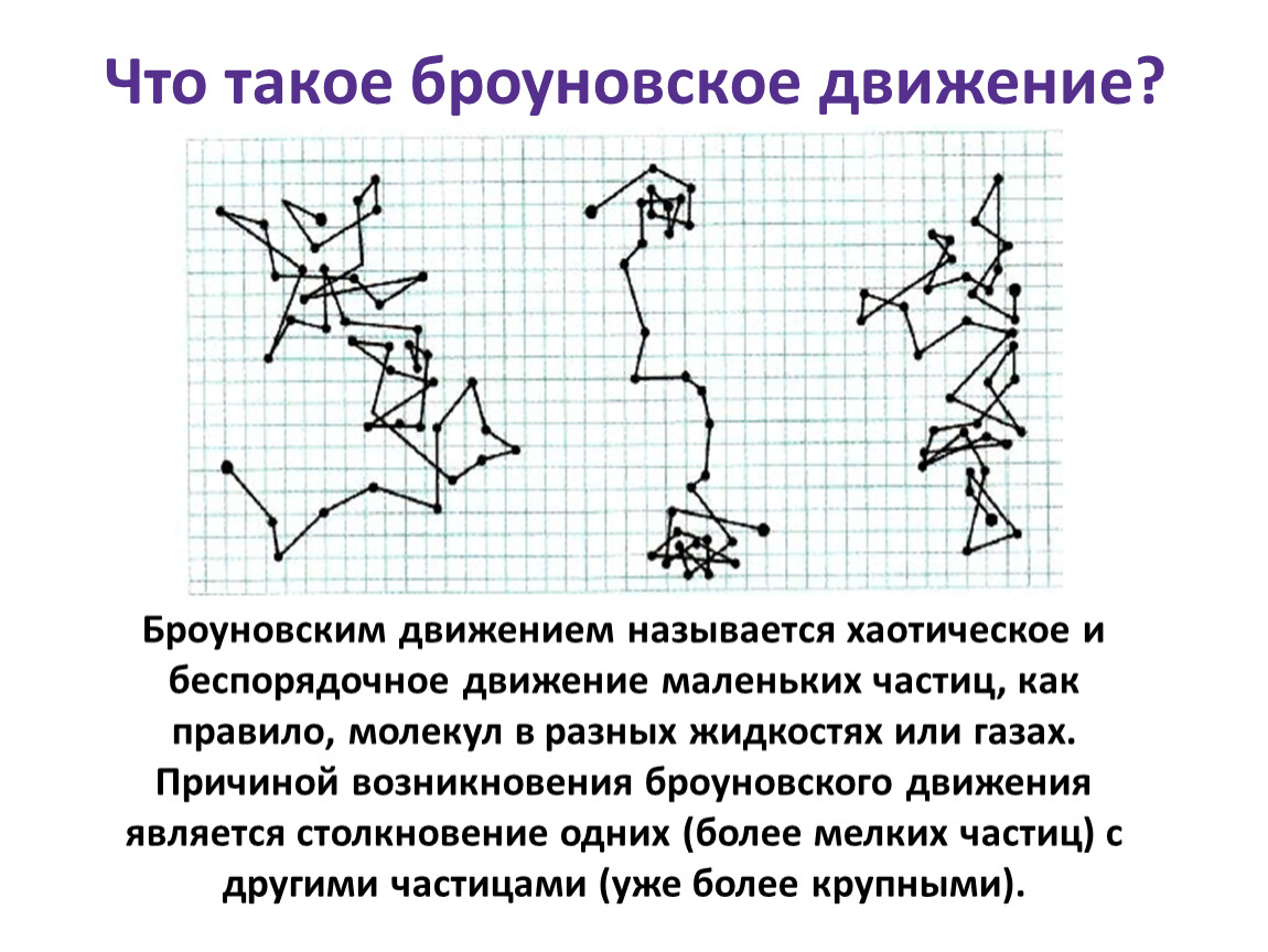 Броуновским движением называется хаотическое и беспорядочное движение маленьких частиц, как правило, молекул в разных жидкостях или газах. Причиной возникновения броуновского движения является столкновение одних (более мелких частиц) с другими частицами (уже более крупными).